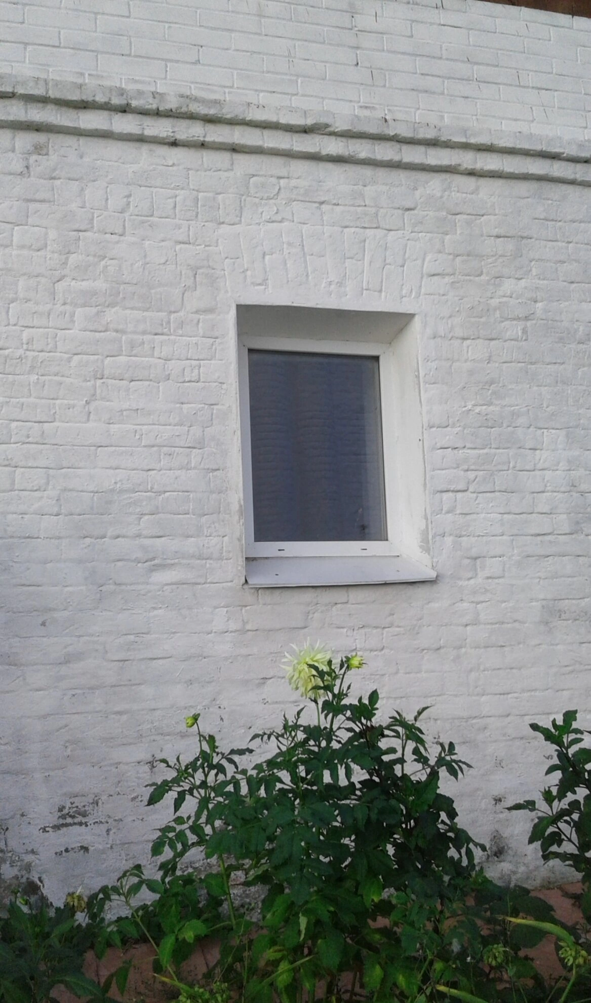 На представленной фотографии запечатлён фрагмент стены Спасо-Преображенского храма, известного в народе как Мельничный, что находится в древнем городе Шуя Ивановской области. Изображённое окно, расположенное в цокольной части здания, выполнено в простой, аскетичной форме, характерной для хозяйственных и подсобных помещений православных церквей. Белая рама окна контрастирует с фактурной поверхностью стены, создающей благородный образ старины.