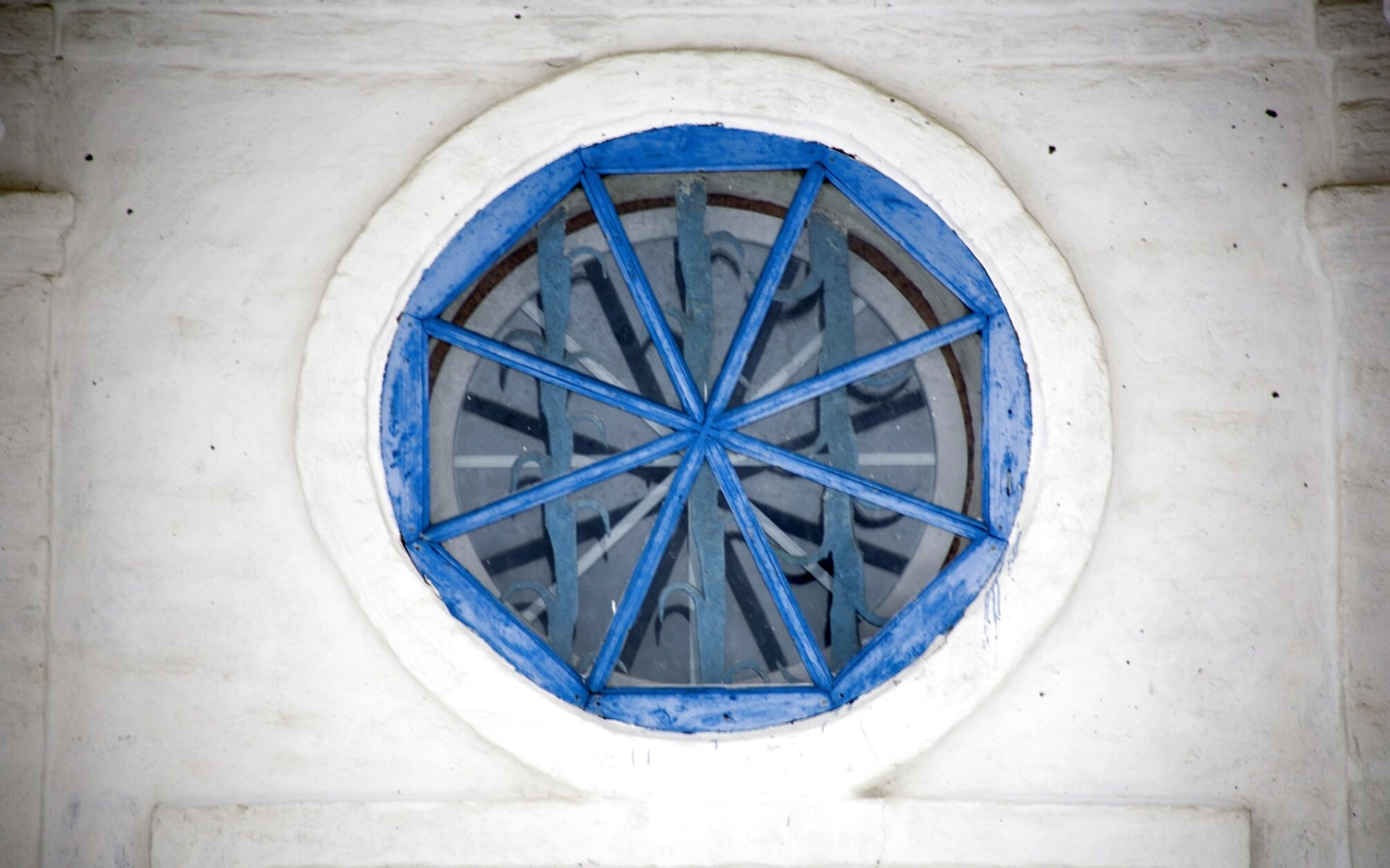 На представленной фотографии запечатлено декоративное круглое окно-люкарна, украшающее фасад Церкви Иконы Божией Матери Тихвинская, что в селе Выпуково. Окно обрамлено изящной кованой решеткой, выкрашенной в лазурный цвет, который символически отсылает к небесной чистоте и покровительству Пресвятой Богородицы. Данный архитектурный элемент характерен для русского церковного зодчества и служит для освещения чердачного пространства или подкровельных помещений храма.