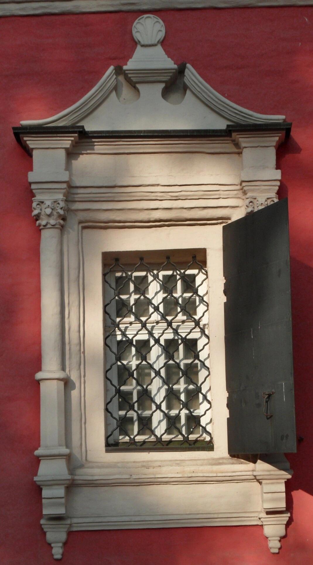 Окно обрамлено богатым белым декоративным наличником, включающим по бокам стилизованные колонны и завершающимся изящным фронтоном в верхней части. Такое архитектурное решение характерно для храмового строительства конца XVII - начала XVIII веков, когда декоративное убранство фасадов приобретало особую значимость. Стена храма, на которой расположено окно, окрашена в теплый красно-розовый цвет, традиционный для многих московских церквей.