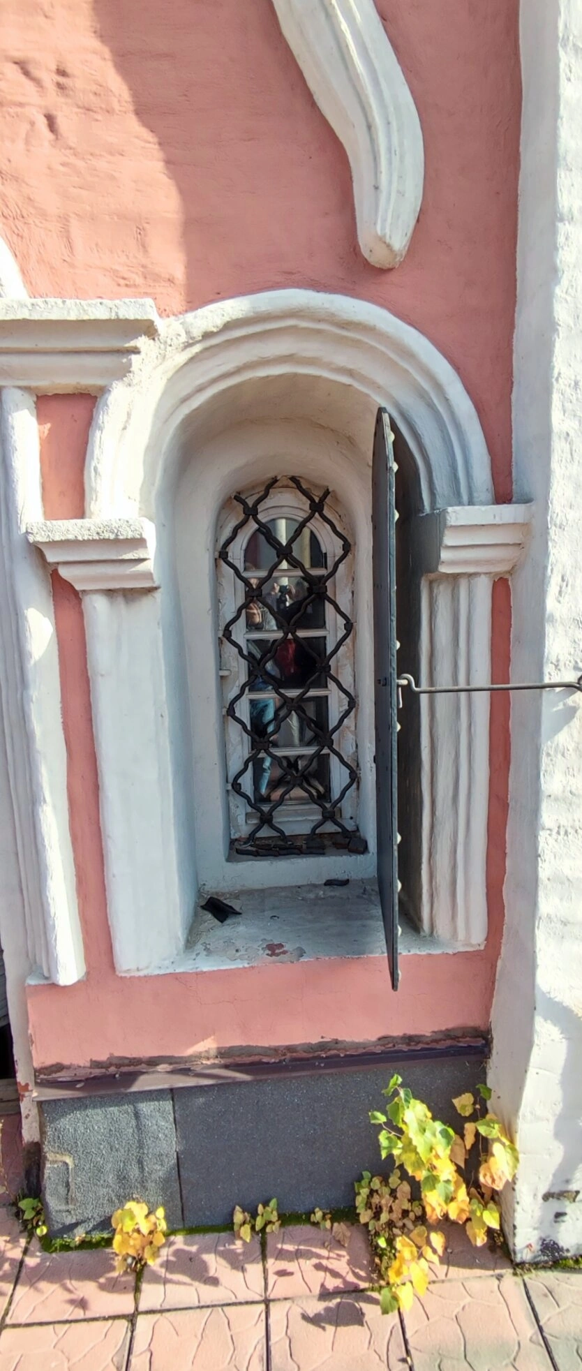 Окно защищено ажурной кованой решёткой с геометрическим узором в виде ромбов, выполненной искусными мастерами кузнечного дела. Деревянные ставни, традиционные для русских храмов, частично приоткрыты, демонстрируя глубину оконного проёма. Одна из ставен закреплена на стене при помощи металлического крепления.