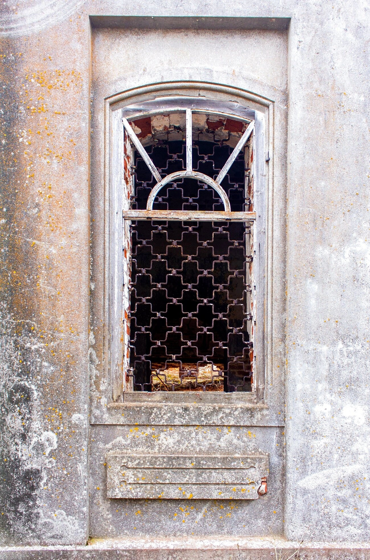 Деревянная оконная рама, сохранившая фрагменты белой краски, находится в частично разрушенном состоянии. Металлическая решетка, установленная в нижней части окна, имеет декоративный узор, напоминающий переплетенные квадраты, однако некоторые ее элементы утрачены. За оконным проемом просматривается кирпичная кладка и темное пространство, что свидетельствует о заброшенности помещения.