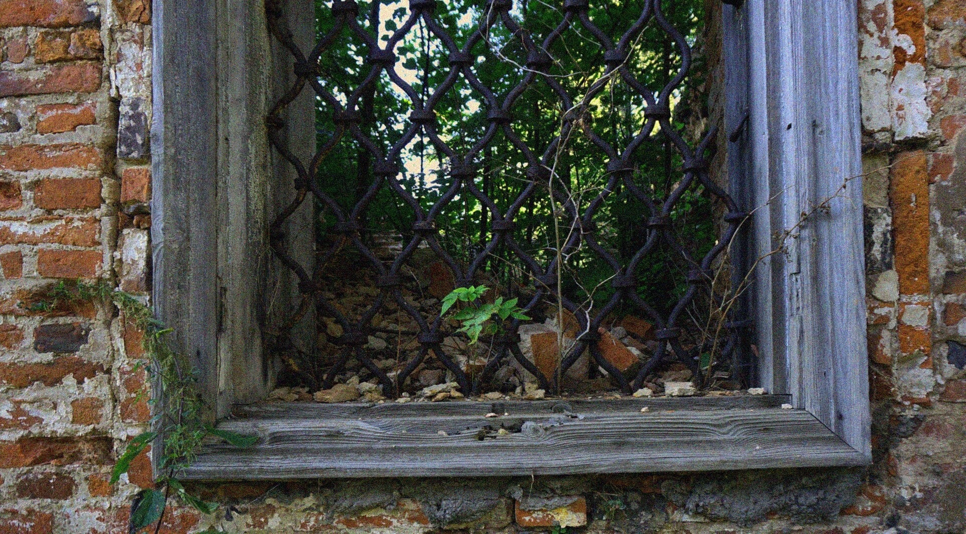 Кирпичные стены, местами сильно разрушенные, несут на себе печать времени и скорби. На подоконнике и у его подножия лежат опавшие листья и сухие ветви, говорящие о долгих годах забвения. Однако даже в этом состоянии упадка и разрушения проявляется знамение жизни – из-под камней пробивается молодая зелёная поросль, словно напоминая о вечном обетовании и возможности воскресения из руин.