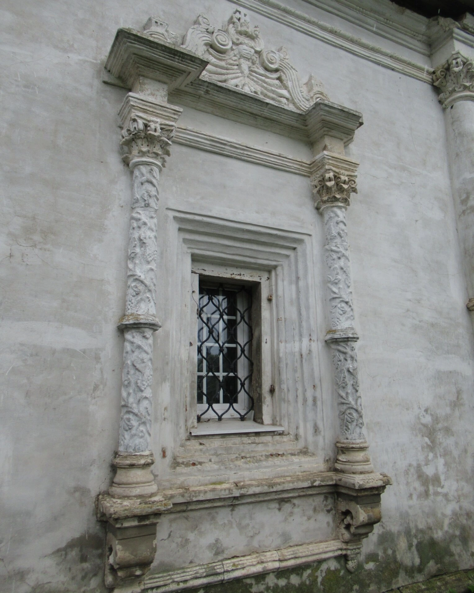 Окно имеет глубокий арочный проём, обрамлённый мощным профилированным откосом. Его обрамление составляет целый архитектурный ансамбль: по сторонам выстроились декоративные колонны, увенчанные резными капителями, от которых расходятся изящные архивольты. Простенки украшены филёнками и лепными элементами, возможно, имеющими символическое значение. В глубине проёма хорошо видна кованая металлическая решётка, оберегающая святость внутреннего пространства храма от внешнего мира.