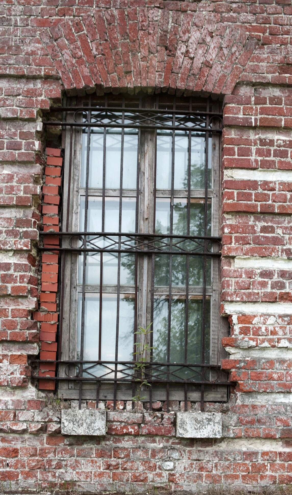 Окно, обрамленное массивной кирпичной кладкой, украшено разгрузочной аркой, которая не только выполняет конструктивную функцию, но и придает архитектурному элементу особую благородную строгость. Защитная кованая решетка, установленная в проеме, символизирует неприкосновенность и святость храмового пространства, оберегая дом молитвы от проникновения извне.