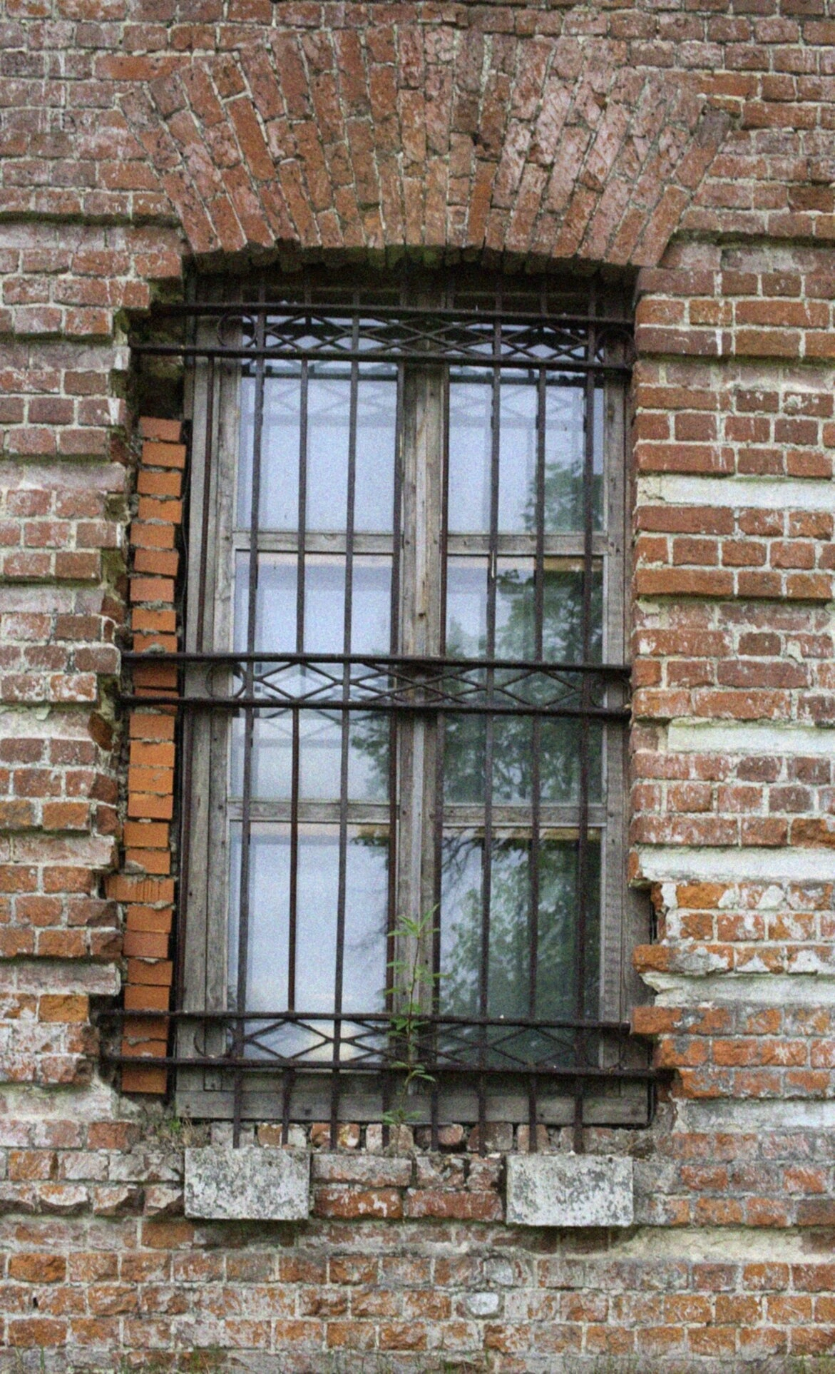 Основанием служит стена из красного кирпича, чья фактура и цвет свидетельствуют о почтенном возрасте сооружения. Над оконным проемом взгляд отмечает разгрузочную арку — архитектурный прием, характерный для традиционного церковного строительства, предназначенный для равномерного распределения нагрузки свода. Примечательны следы времени на кирпичной кладке: местами заметны элементы естественного разрушения, что придает особую атмосферу благоговейной старины.