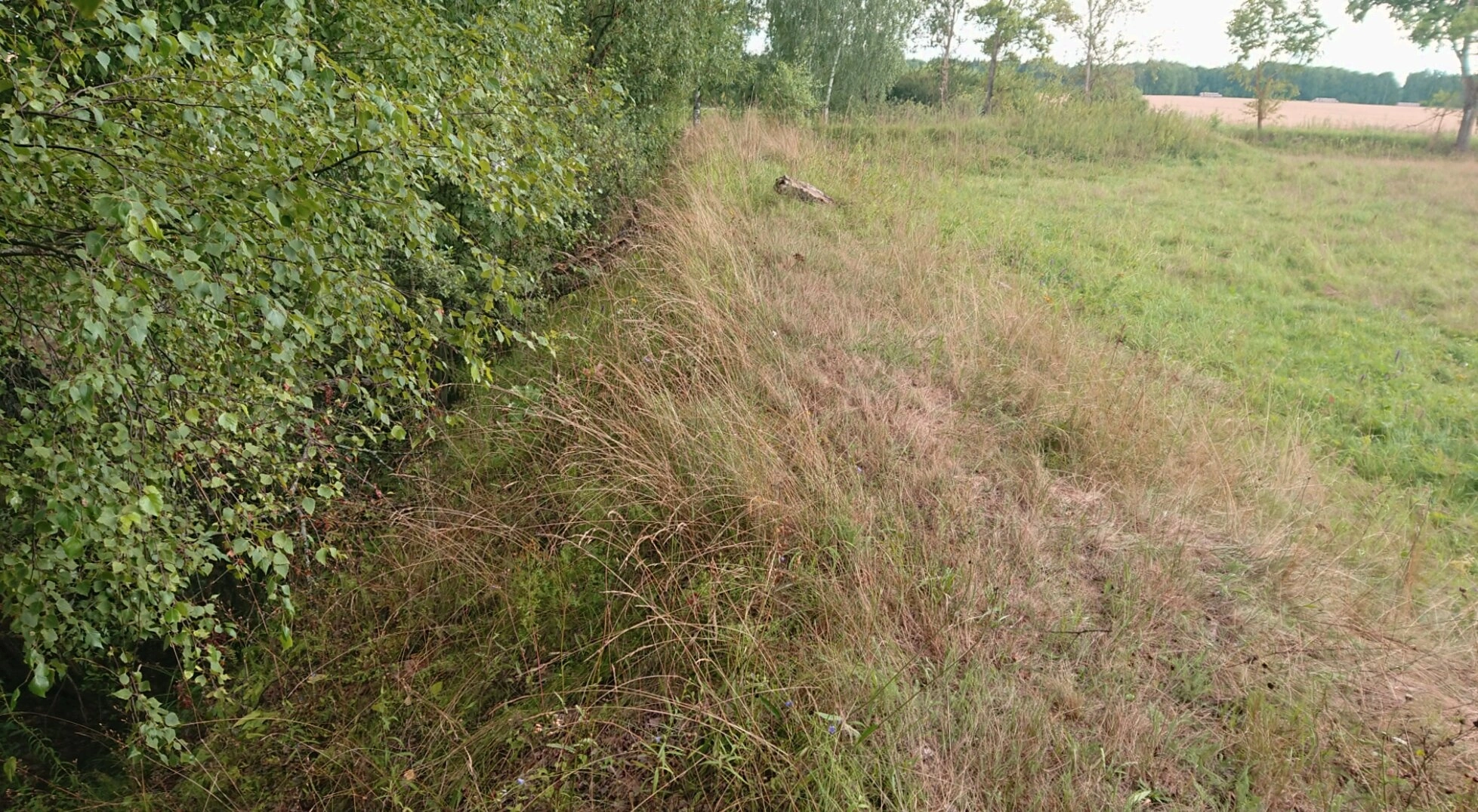 В левой части композиции изображены густые зелёные насаждения — вероятно, кустарники и молодые деревья, создающие естественное обрамление пейзажа. Справа простирается травянистый луг, характерный для сельскохозяйственных угодий данного региона. В перспективе просматриваются контуры древесных массивов, определяющих ландшафтные особенности местности.