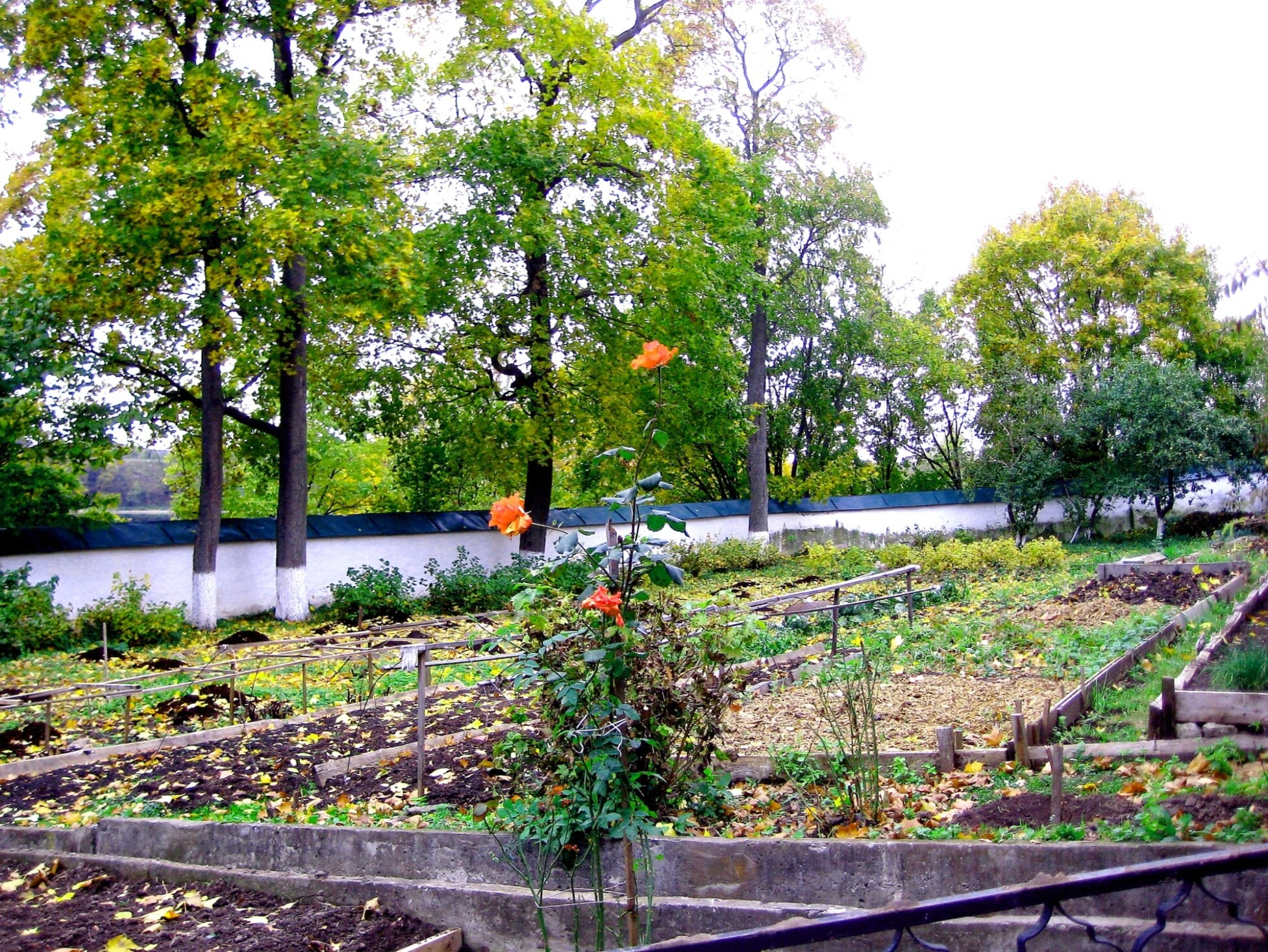 На представленной фотографии запечатлен осенний вид в Снетогорском монастыре Рождества Пресвятой Богородицы, что под Псковом. На переднем плане открывается монастырский сад или огород, где возделанные грядки соседствуют с опавшими желтыми листьями, символизируя бренность земного и цикличность бытия. В центре кадра алеют последние цветы, возможно, ипомеи, напоминая о неувядающей красоте Божьего мира.