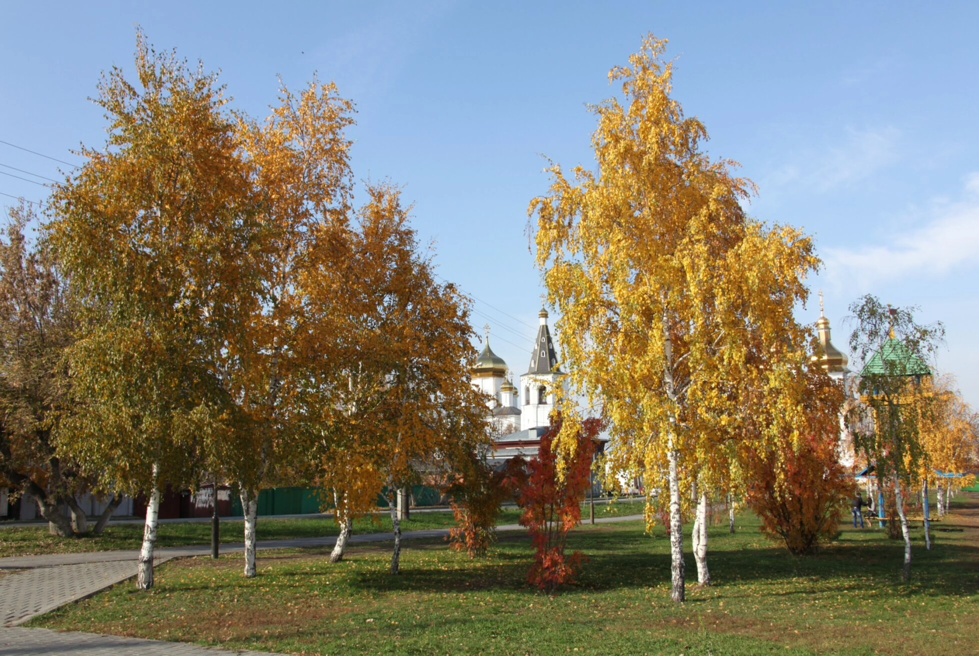 На фотографии запечатлен благодатный осенний пейзаж на территории Свято-Троицкого мужского монастыря в городе Тюмени. Белоснежные стволы берез, облаченные в золотые и багряные ризы осенней листвы, обрамляют вид на святую обитель. На заднем плане величественно возвышаются сияющие на солнце купола храмов монастырского комплекса, увенчанные православными крестами.