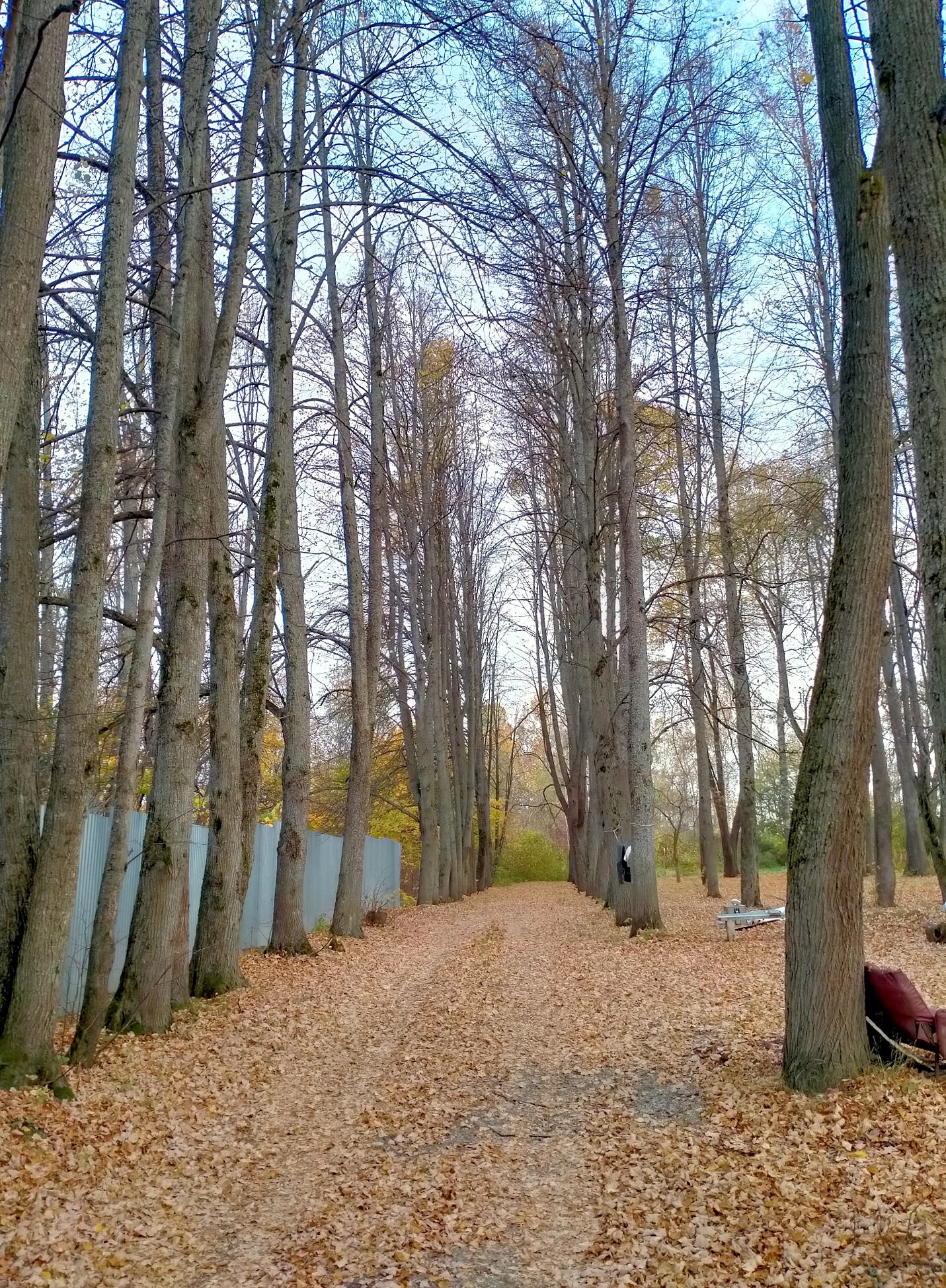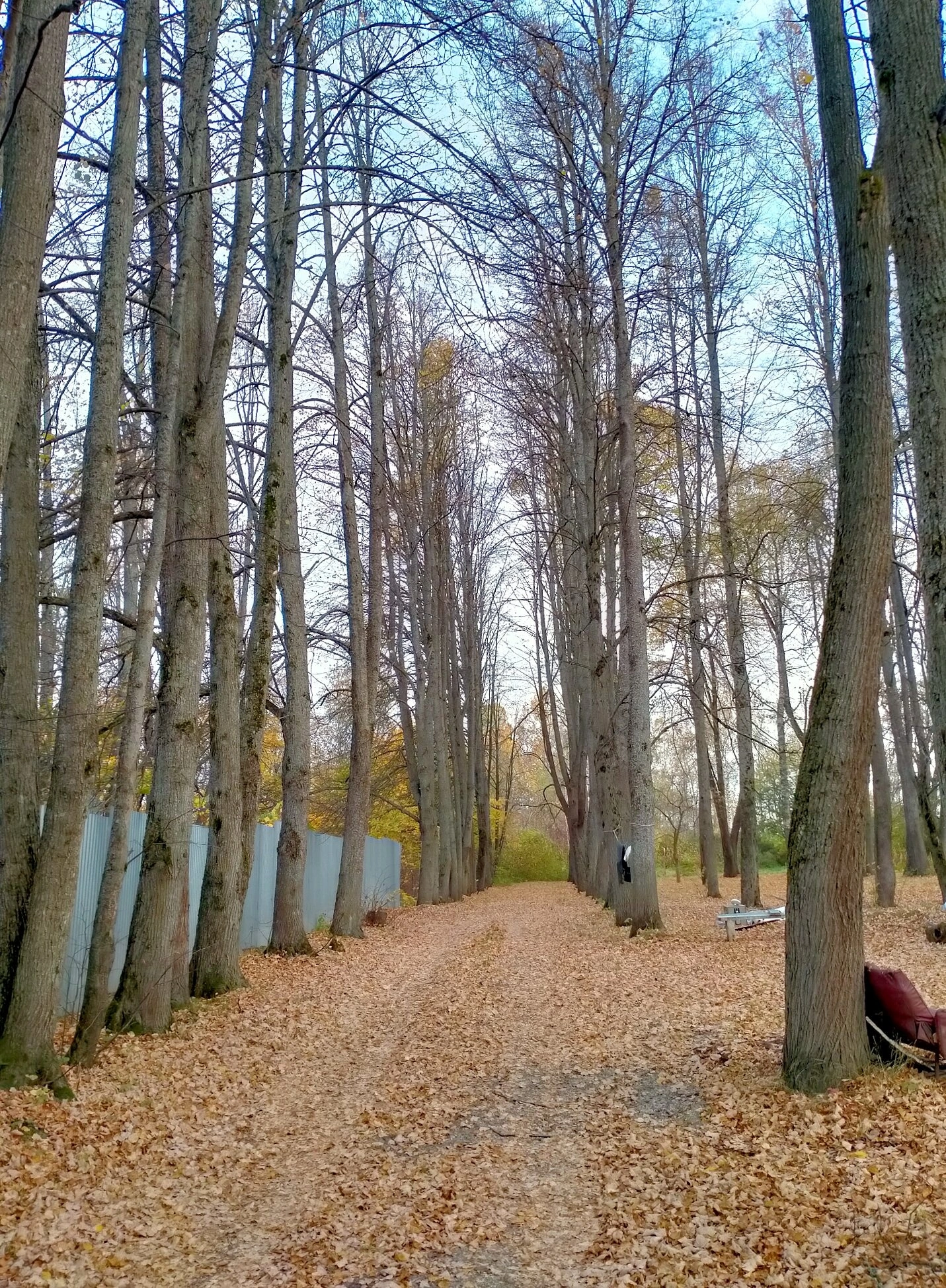Аллея, устланная золотисто-коричневым ковром опавшей листвы, обрамлена высокими деревьями, чьи почти обнажённые ветви создают особое осеннее настроение. Несколько уцелевших жёлтых листьев на ветвях напоминают о недавней красоте осеннего убранства. Слева от аллеи просматривается металлическое ограждение, справа же внимание привлекает фрагмент старинной мебели, свидетельствующий о богатой истории этого места.