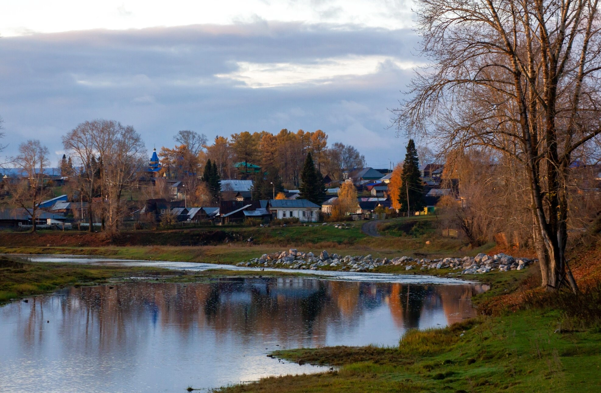За рекой, на пригорке, теснятся скромные деревянные дома, крыши которых виднеются среди деревьев, облачённых в золото и багрянец. Эта скромная жилая застройка — свидетельство истории рабочего посёлка, возникшего более двух столетий назад при железоделательном заводе. Нынешний осенний убор лесов, окружающих село, поражает своим разнообразием — от светлых берёзовых рощ до тёмных еловых массивов, в которых вызревает голубика, брусника и даже морошка.