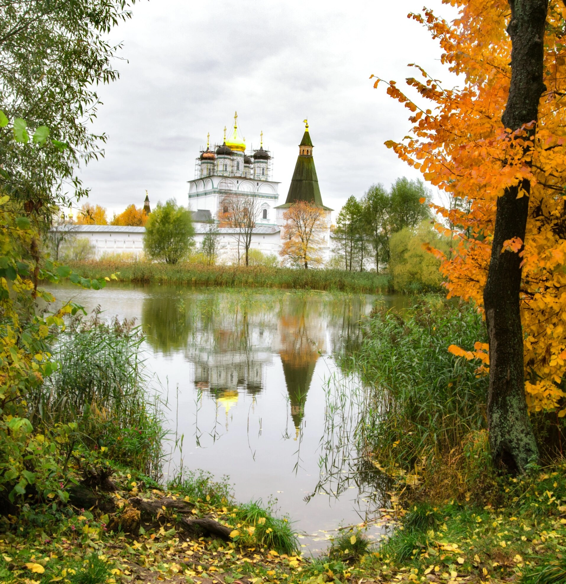 На фотографии запечатлен величественный вид Иосифо-Волоцкого ставропигиального мужского монастыря, одной из самых почитаемых православных обителей Подмосковья. Осенняя пора одела прибрежные деревья в золотые и багряные ризы, а спокойная гладь монастырского озера отражает белоснежные стены и сияющие золотом купола, словно символизируя единение земной красоты и небесного благоговения.