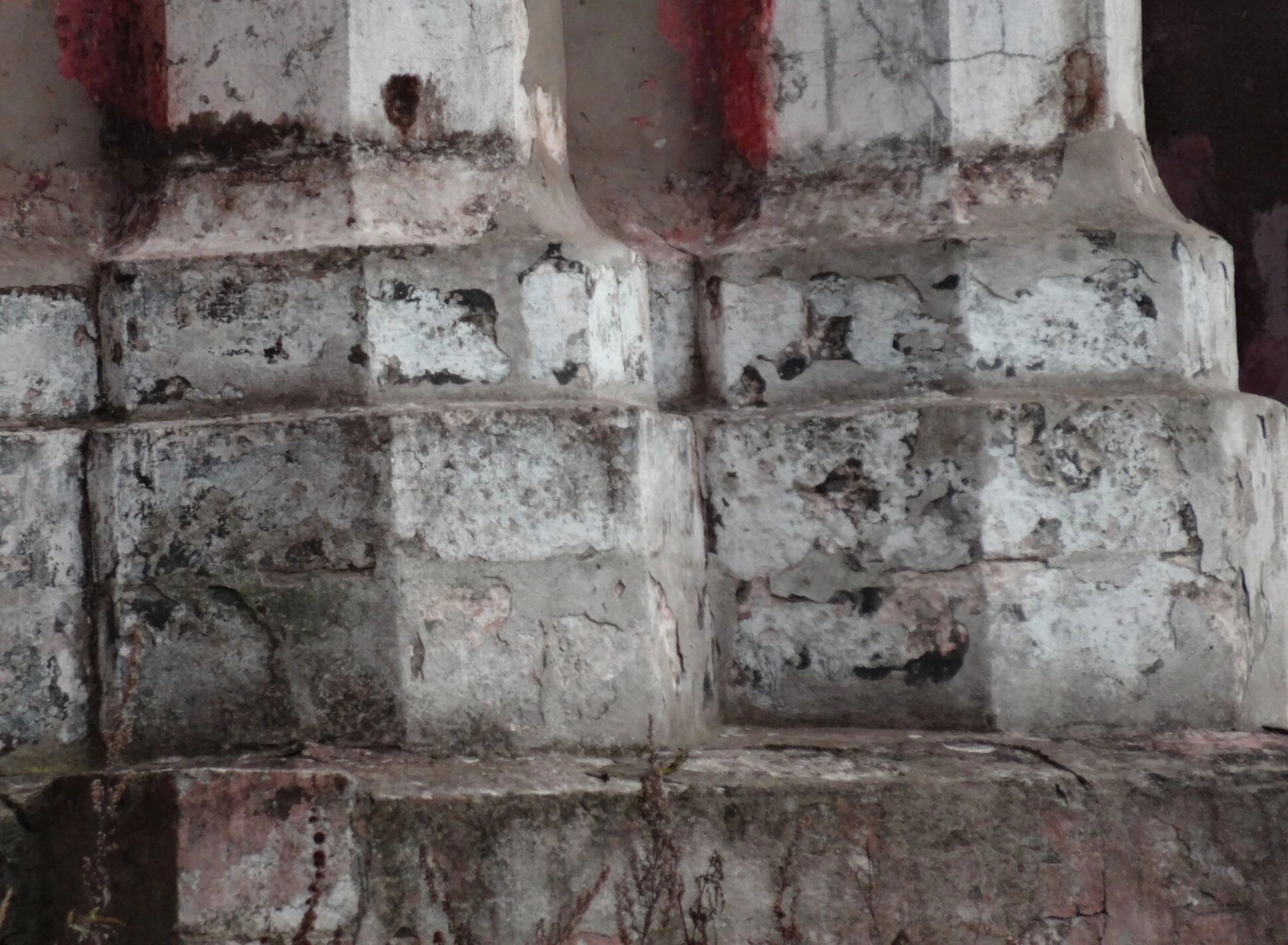 Поверхность камня носит следы многовекового бытования: заметны сколы, трещины и участки осыпающейся штукатурки, обнажающие материал кладки. Вмятины и неровности являются немыми свидетелями воздействия времени и природных стихий. Присутствуют также потемнения, вызванные естественной влажностью.