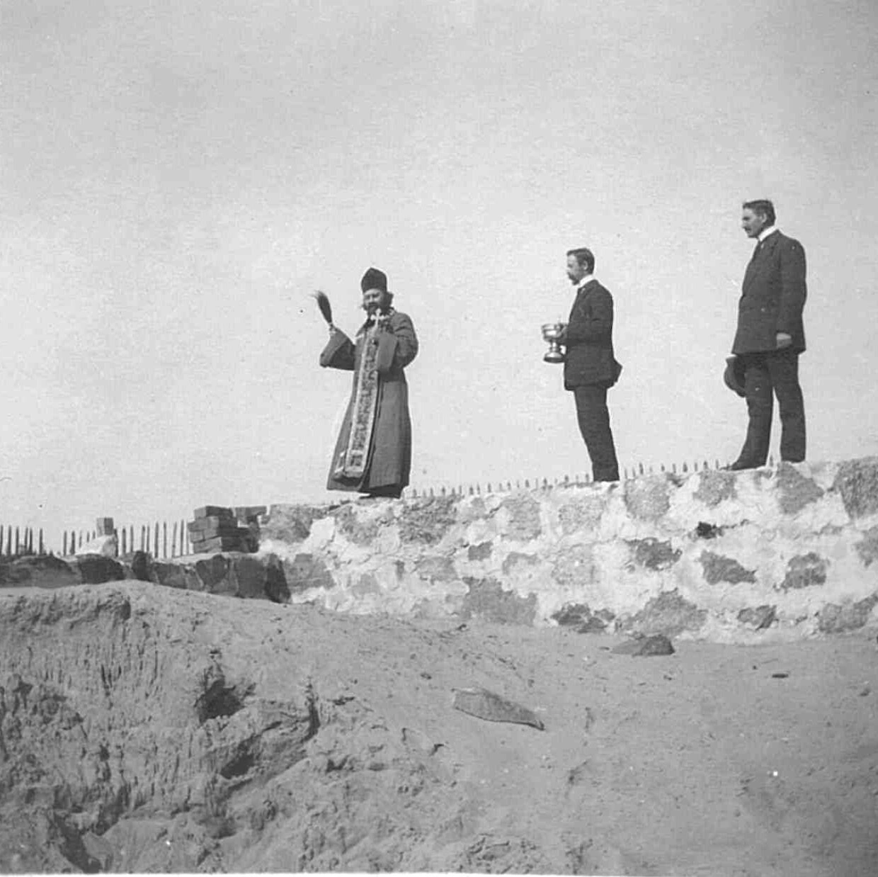 В центре композиции изображён священнослужитель в облачении, совершающий молебен с использованием кадила. Совершаемый им чин освящения места предполагает особые молитвы, призывающие Божие благословение на начинаемое строительство. По церковной традиции, закладка храма сопровождается специальным богослужением, которое и зафиксировано на фотографии.