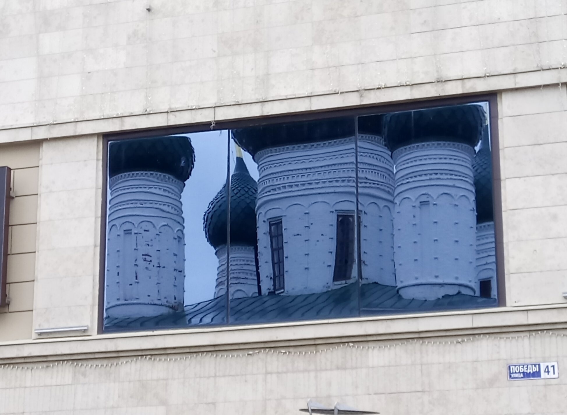 На представленной фотографии запечатлён удивительный момент символического диалога эпох: в стеклянной поверхности современного торгового центра «Аура» в Ярославле отражается величественный образ Церкви Вознесения Господня – памятника русского православного зодчества XVII века. Чётко видны отражения золотых куполов храма и элементы его нарядного фасада, создающие эффектную оптическую иллюзию, где святыня парит в небесах, словно являя собой вневременной идеал.