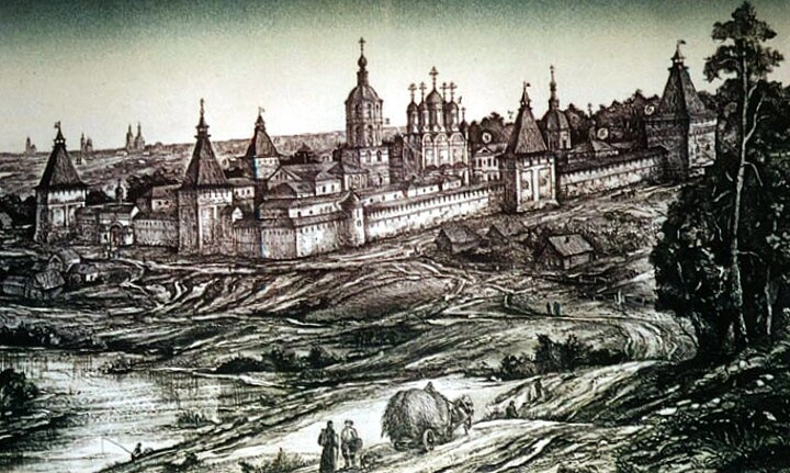 Монастырь возвышается на живописном холме, окруженный мощными крепостными стенами с неприступными башнями, которые свидетельствуют о его оборонном значении в прошлом. За стенами виднеются многочисленные храмовые главы и колокольни, некоторые из которых завершаются традиционными шатровыми верхами, характерными для русского церковного зодчества.