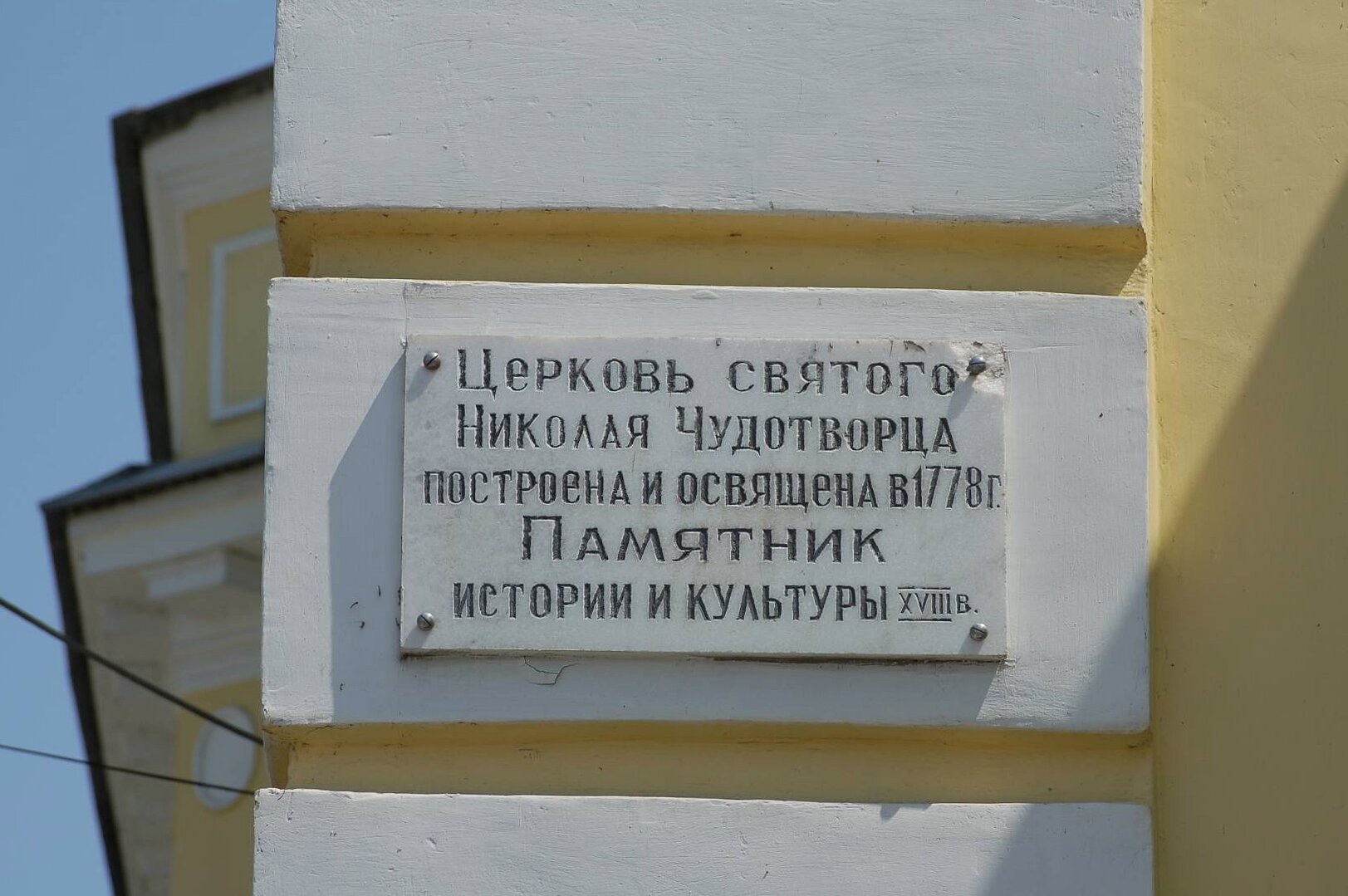 На представленной фотографии запечатлена историческая памятная доска, укреплённая на стене старинного православного храма. Мемориальная таблица свидетельствует о том, что здание является Церковью Святого Николая Чудотворца, что в городе Таганроге. Согласно тексту на доске, святыня была возведена и освящена в 1778 году от Рождества Христова.