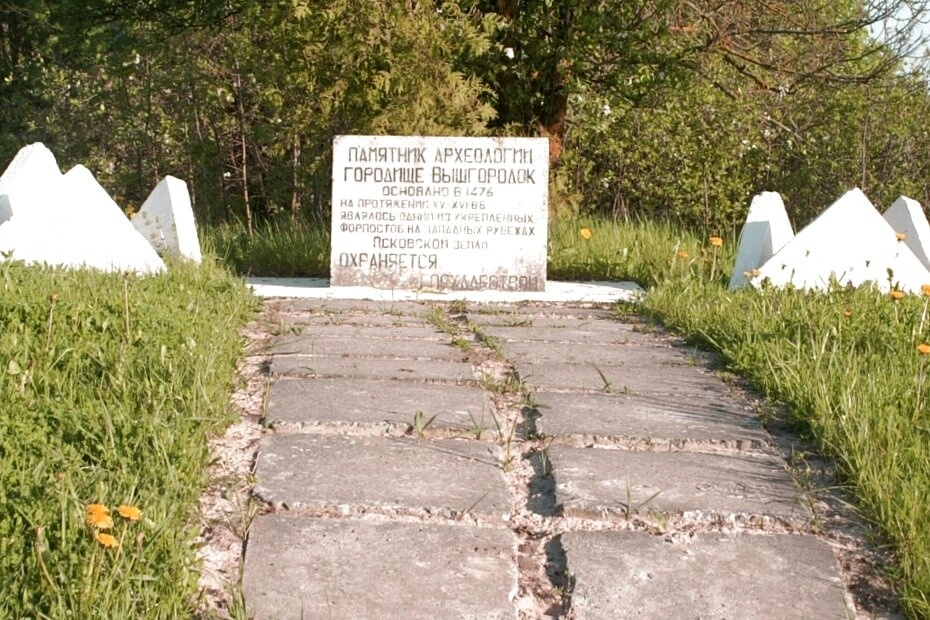 На представленной фотографии запечатлен памятник археологии федерального значения «Городище Вышгородок», расположенный в Пыталовском районе. На переднем плане снимка видна аккуратная дорожка из бетонных плит, ведущая к памятному знаку, установленному в честь данного исторического объекта. По обе стороны от дорожки произрастает свежая трава с желтыми цветами одуванчиков, создающая живописное обрамление.