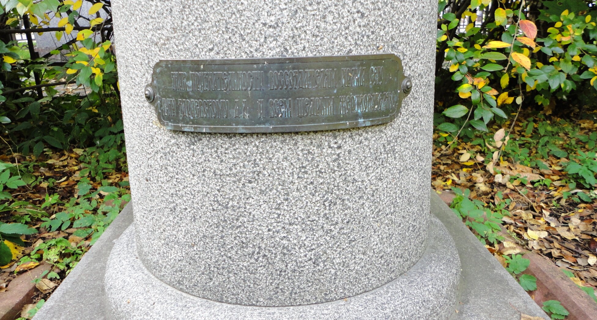 Монумент выполнен в виде гранитного столба, возвышающегося на ступенчатом основании из того же природного камня. Серый гранит обладает характерной зернистой фактурой, придающей памятнику особую монументальность и духовную строгость. На лицевой поверхности столба закреплена изогнутая металлическая табличка с рельефным текстом, который, к сожалению, не полностью читаем на данном изображении.