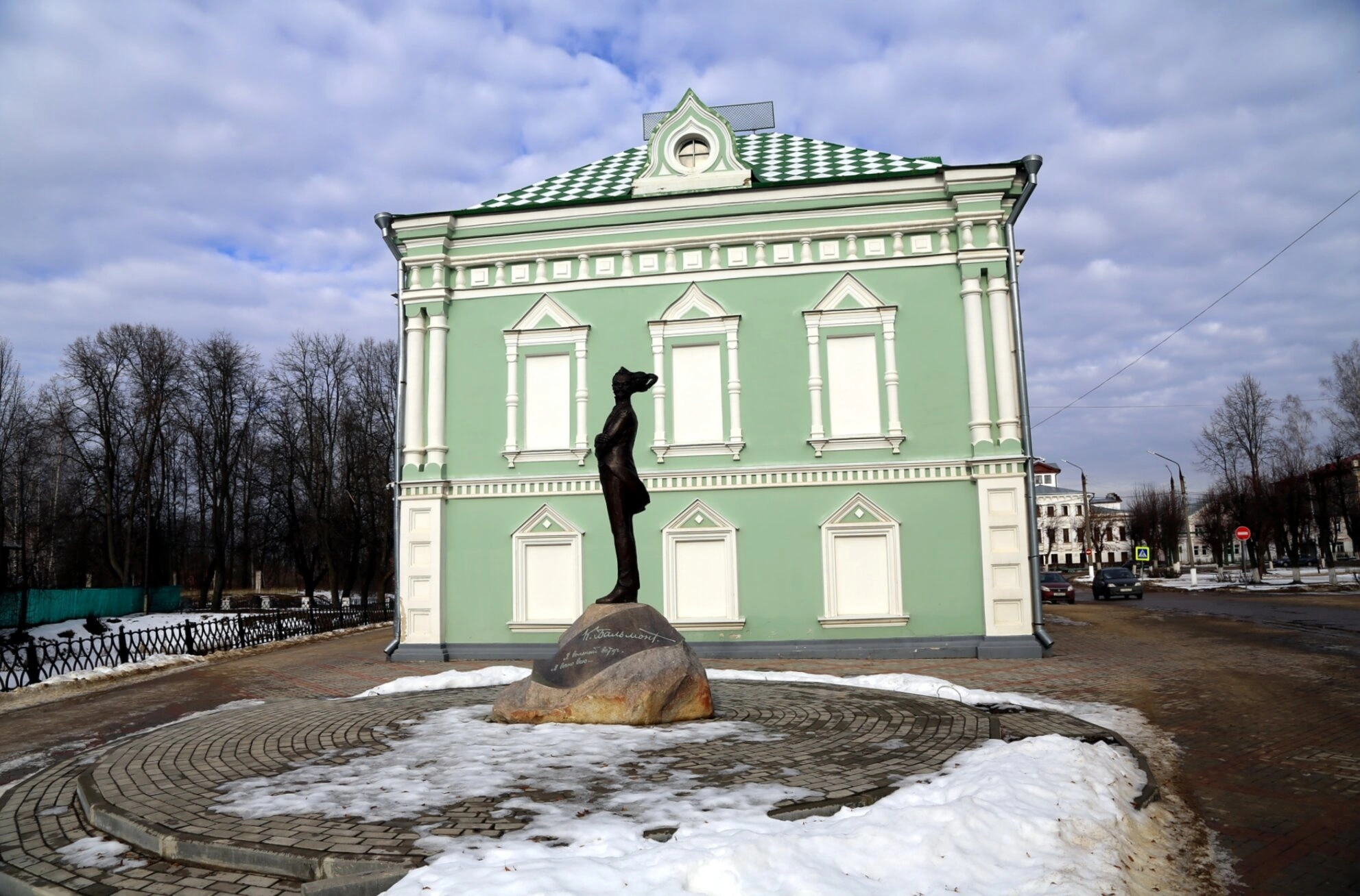На представленной фотографии запечатлен памятник выдающемуся русскому поэту Серебряного века Константину Дмитриевичу Бальмонту, уроженцу шуйской земли. Монумент установлен на массивном природном камне перед фасадом Шуйского историко-художественного и мемориального музея имени М. В. Фрунзе, что символично соединяет память о литературном гении с историческим наследием города.