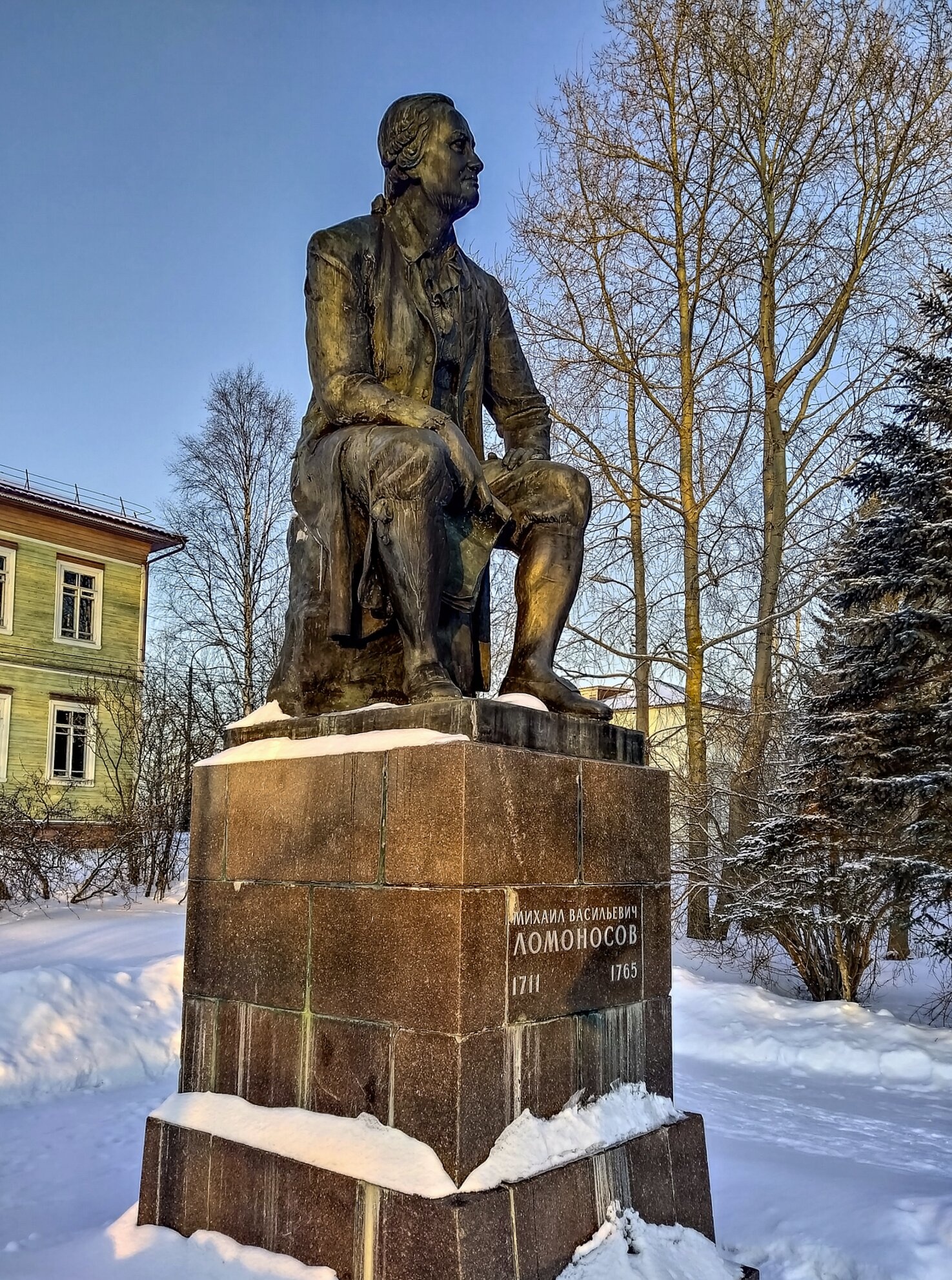 Снимок сделан в зимнее время, когда памятник предстаёт в окружении заснеженного парка. Голые ветви лиственных деревьев и вечнозелёная хвоя создают особую атмосферу русского севера, а чистый снег, покрывающий землю и постамент, символизирует духовную чистоту и величие родной земли, взрастившей гения. На заднем плане слева видно деревянное здание, возможно, относящееся к местной архитектуре, что добавляет кадру исторической достоверности.