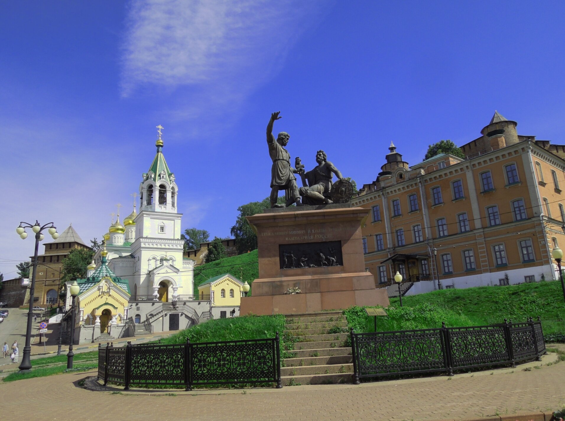На фотографии запечатлён величественный вид на площадь Народного Единства в историческом центре Нижнего Новгорода. Композиционным центром снимка является точная копия знаменитого московского памятника гражданину Кузьме Минину и князю Дмитрию Пожарскому. Бронзовый монумент, установленный на высоком гранитном постаменте, изображает момент, когда Минин, указывая рукой на Москву, призывает князя Пожарского возглавить народное ополчение для освобождения Отечества от польско-литовских интервентов в Смутное время. Князь Пожарский изображён сидящим, с мечом в одной руке и щитом в другой, выражая готовность встать во главе рати.