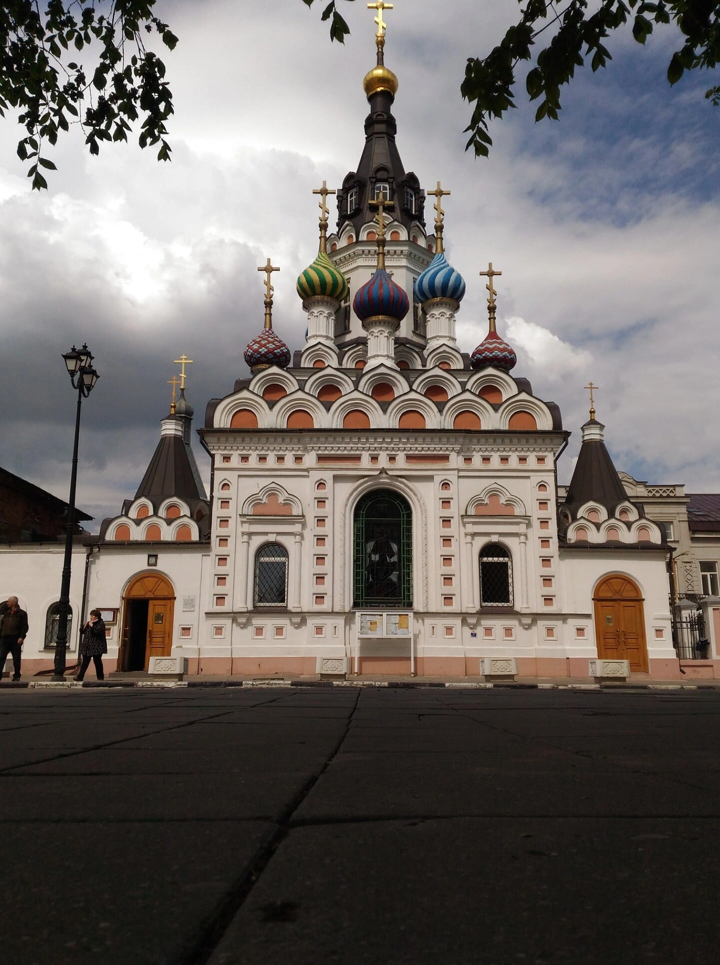 На заднем плане слева величественно располагается храм в честь чудотворной иконы Божией Матери «Утоли моя печали». Церковь, освящённая в 1906 году, является выдающимся образцом русского церковного зодчества рубежа XIX—XX веков. Её архитектурный облик узнаваем благодаря живописному завершению в виде шатра, увенчанного золочёной главкой, и изящной шатровой колокольне. Яркие и разноцветные купола храма, сияющие даже в облачный день, создают неповторимый силуэт в городском пространстве.