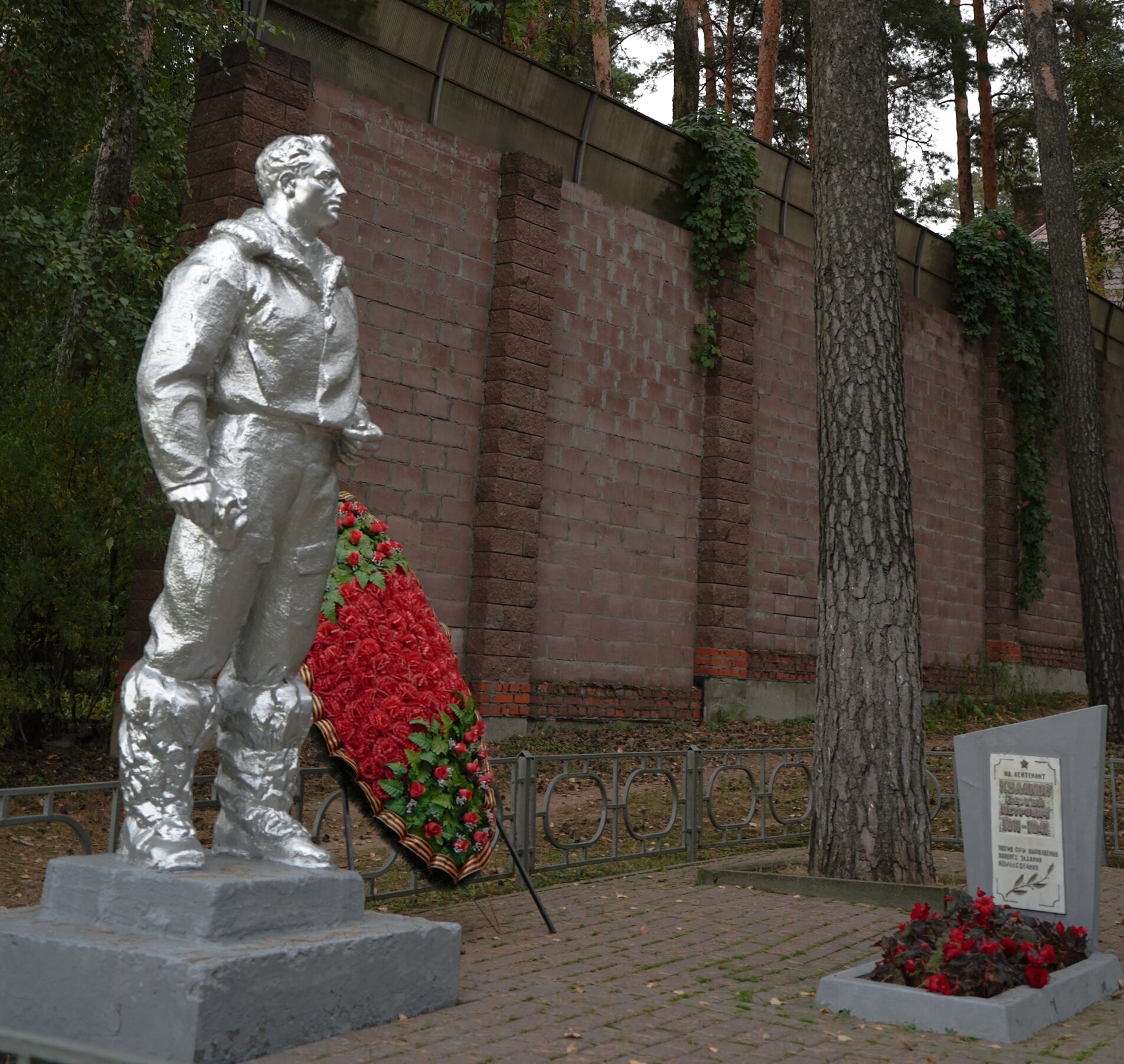 В центре фотографии возвышается памятник-статуя, изображающая усопшего в полный рост в летном обмундировании. Серебристая фигура на гранитном постаменте символизирует земной путь военного летчика, чье служение Отечеству было прервано безвременной кончиной. Слева от основания памятника расположен траурный венок из алых цветов, перевитый георгиевской лентой – символом воинской доблести и жертвенного подвига.