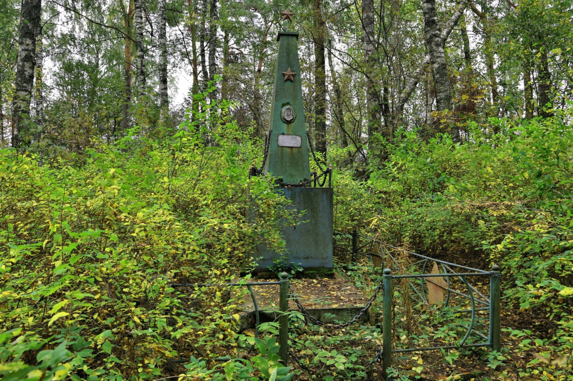 Окружающий ландшафт представляет собой типичный для центральной России осенний пейзаж. Деревья и кустарники, окружающие захоронение, одеты в желто-зеленую листву, создающую атмосферу умиротворения и светлой печали, соответствующую православному отношению к местам вечного упокоения. Фотография передает особое настроение заброшенного, но сохраняющего свое достоинство memorial места.