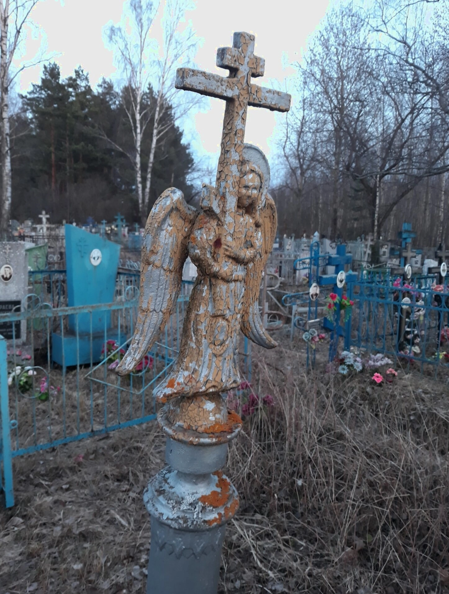 На представленной фотографии запечатлен фрагмент церковного кладбища при Спасо-Преображенской церкви в деревне Сухаренки Городецкого района Нижегородской области. В центре композиции находится монументальное надгробие в виде скорбящего ангела, держащего православный крест. Памятник выполнен из металла с золотисто-белым покрытием, которое со временем подверглось естественному старению, местами проявились следы потускнения и облупившейся краски, что придает образу особую душевную глубину и напоминает о бренности земного бытия.