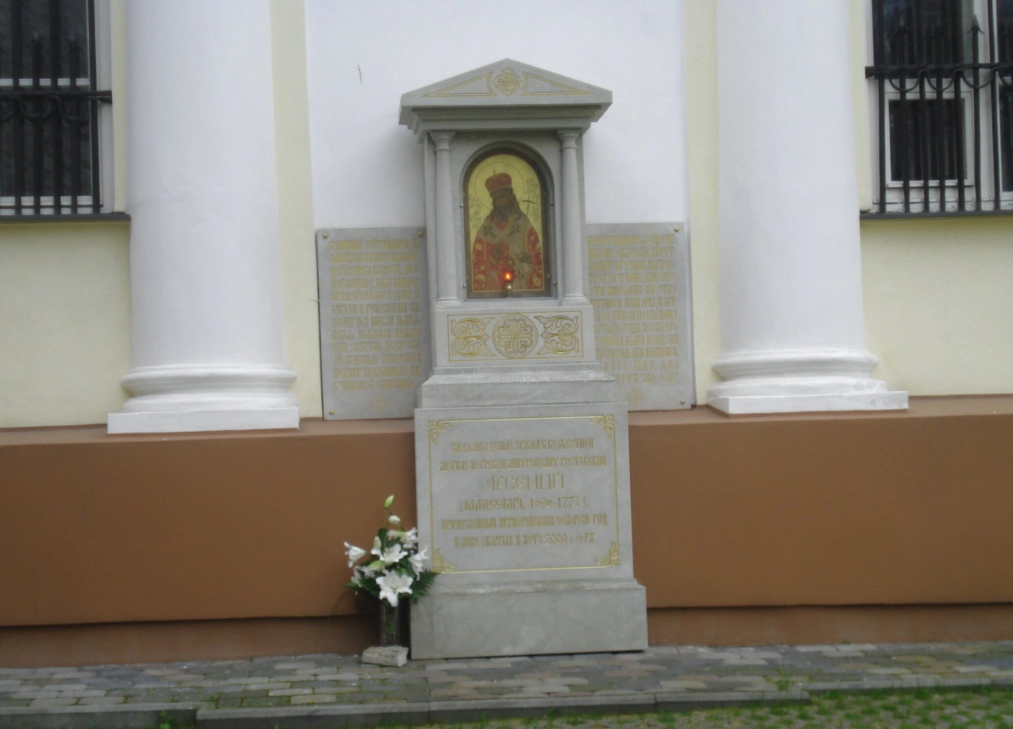 Памятник установлен на аккуратно вымощенной каменной площадке, гармонично вписываясь в архитектурный ансамбль храма и являясь неотъемлемой частью его духовного и исторического наследия.