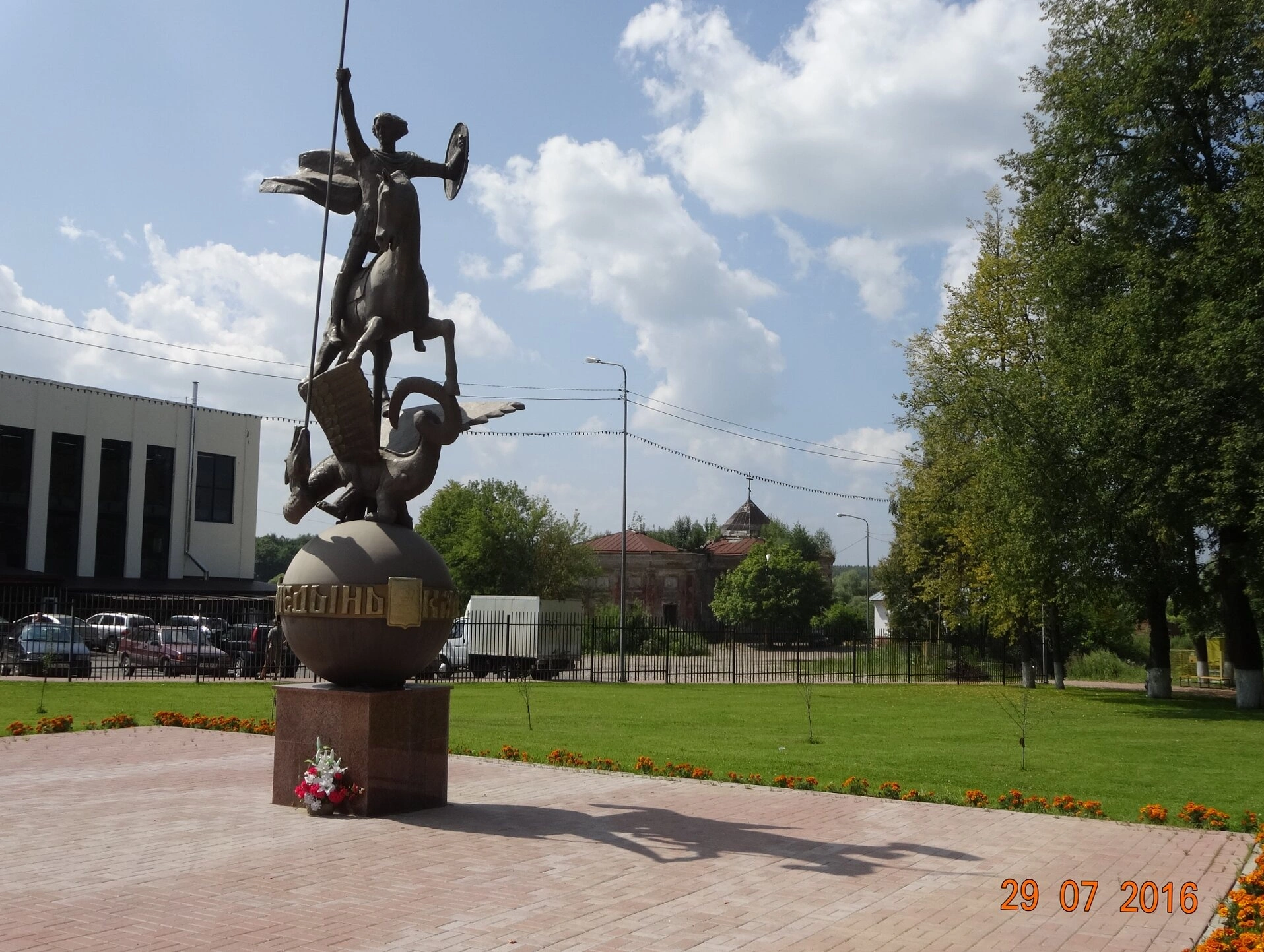 На представленной фотографии запечатлён величественный памятник выдающемуся русскому полководцу, князю Владимиру Андреевичу Храброму, соратнику и двоюродному брату благоверного князя Димитрия Донского. Монумент установлен в историческом центре города Медынь Калужской области, на фоне собора в честь святых равноапостольных царя Константина и матери его Елены.