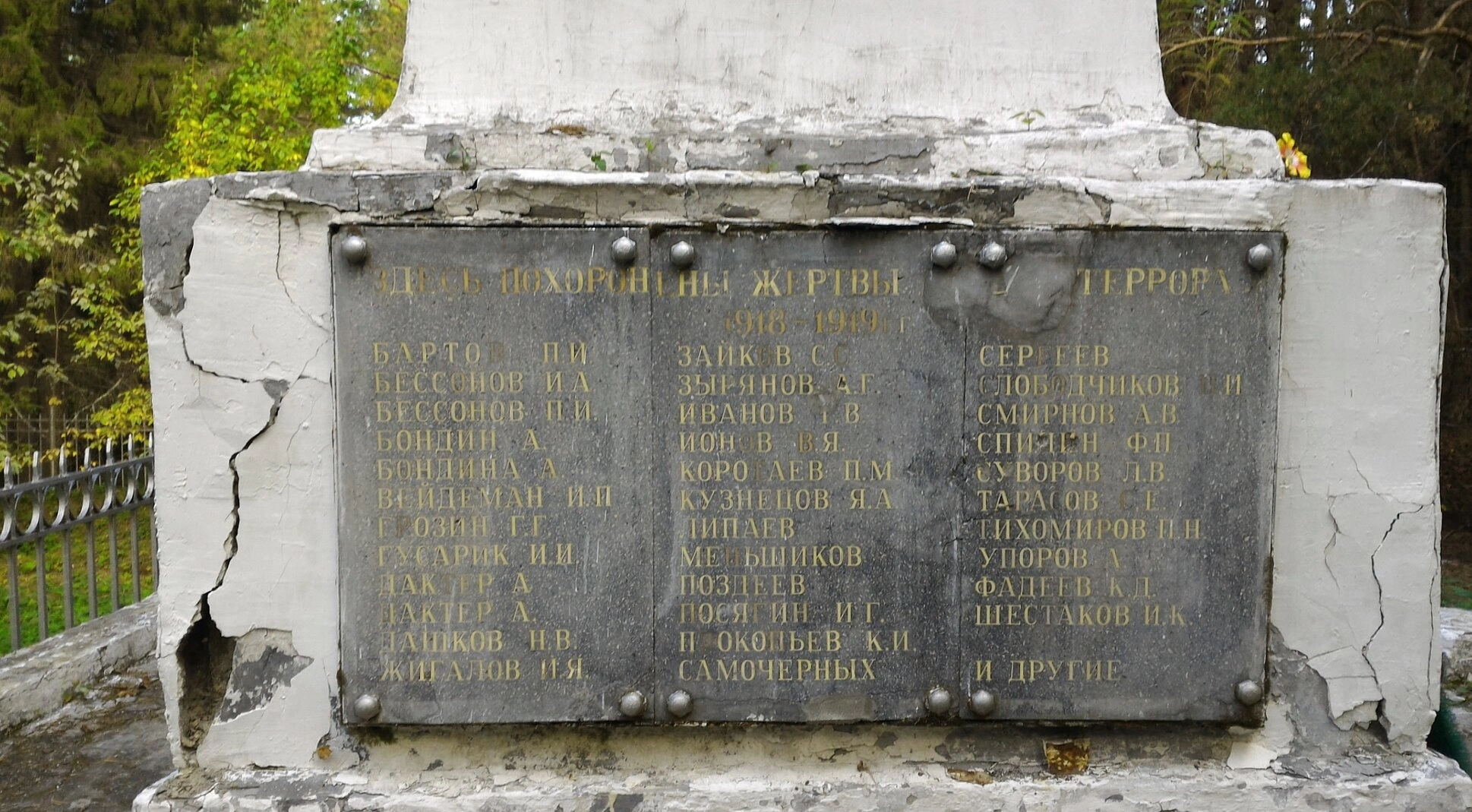 Под этой скорбной надписью размещены три металлические мемориальные таблички, которые, вероятно, содержат имена погребенных здесь православных христиан, пострадавших за веру в период безбожных гонений. Архитектура монумента отличается строгостью и лаконичностью, что соответствует православной традиции поминовения усопших.