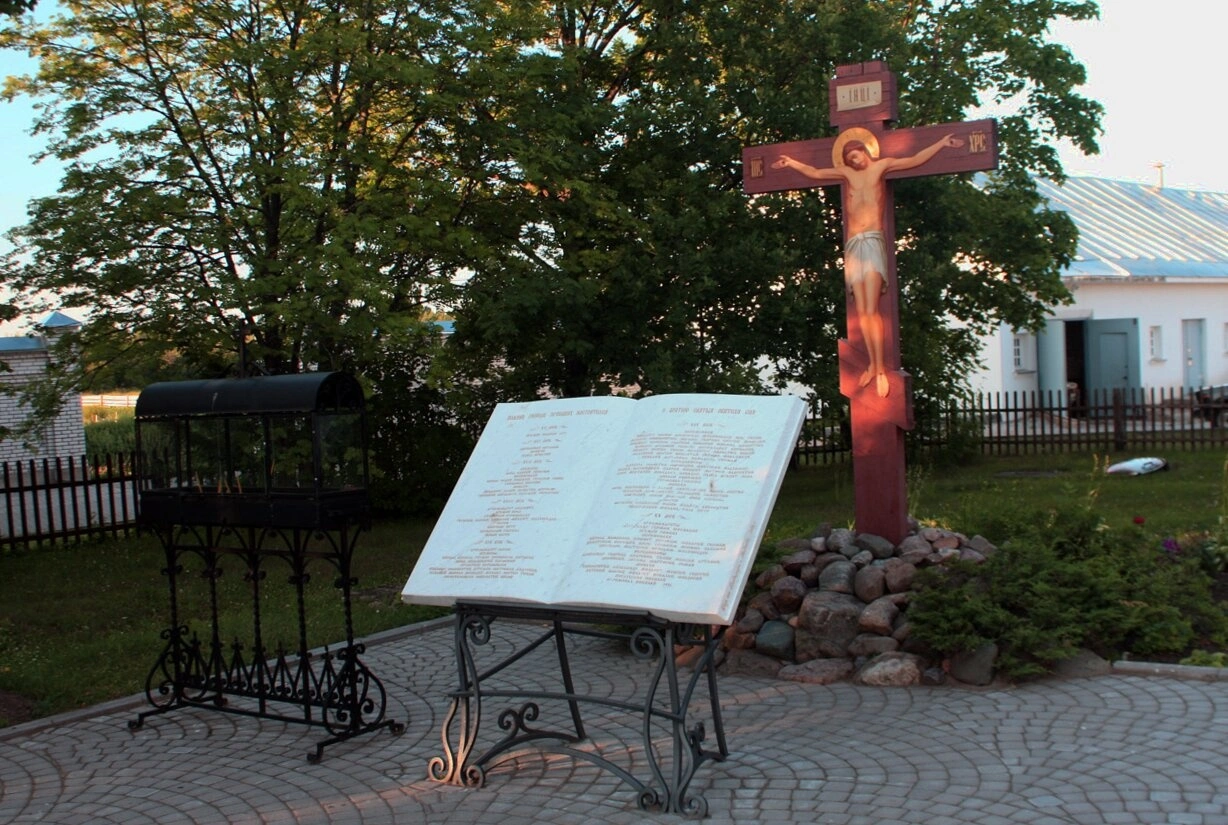 На фотографии запечатлена памятная композиция, расположенная на территории Введено-Оятского женского монастыря, что в Лодейнопольском районе Ленинградской области. Центральным элементом является высокий православный восьмиконечный крест с резным распятием, установленный на массивном каменном основании. Крест знаменует собой искупительную жертву Христа и является символом вечной жизни и спасения.