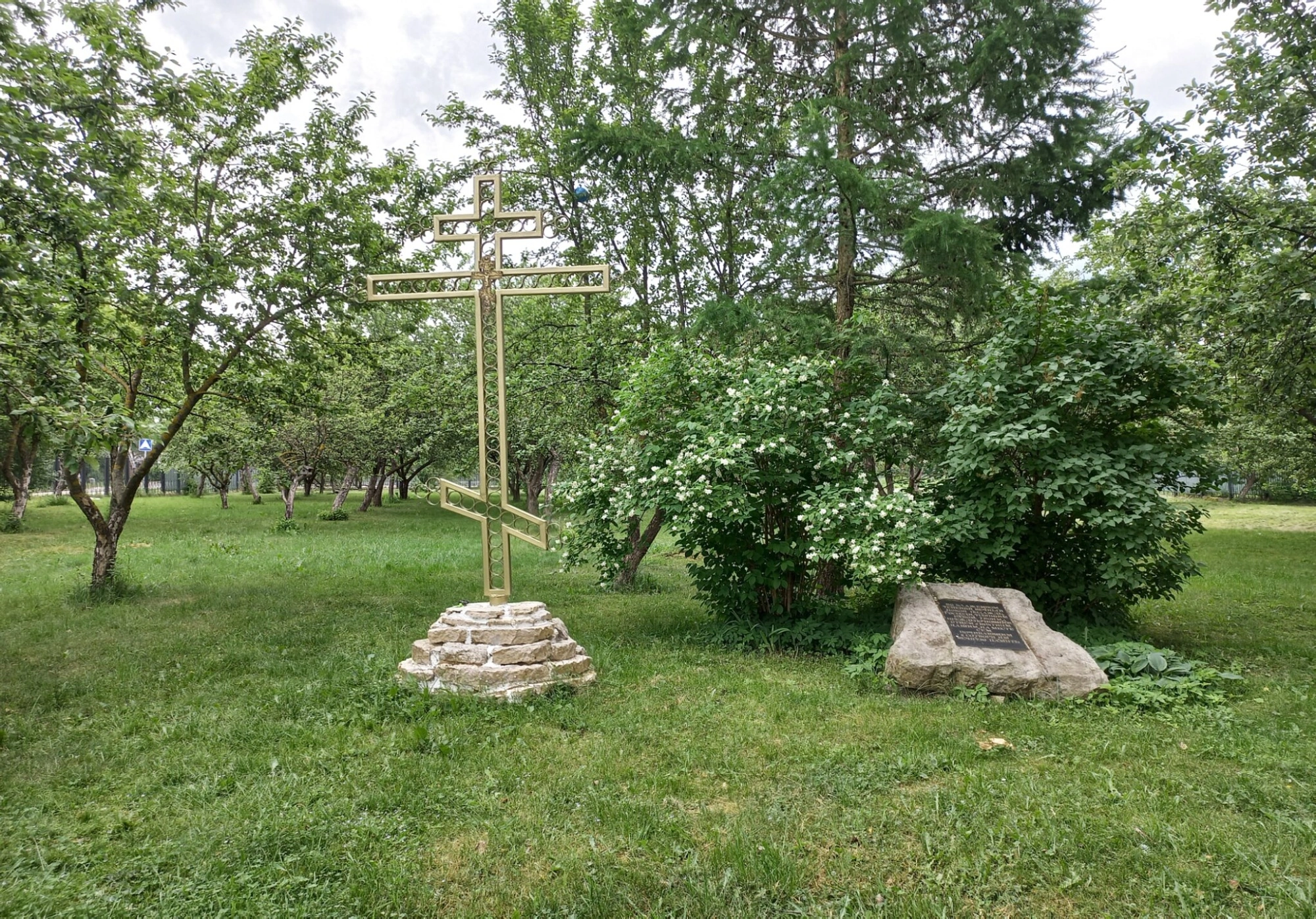 Рядом с крестом расположен большой валун, выполняющий роль мемориального камня. На его лицевой поверхности закреплена памятная табличка, текст на которой, к сожалению, неразличим на снимке. Подобные камни часто устанавливают в память о значительном событии, основателе или благотворителе храма.