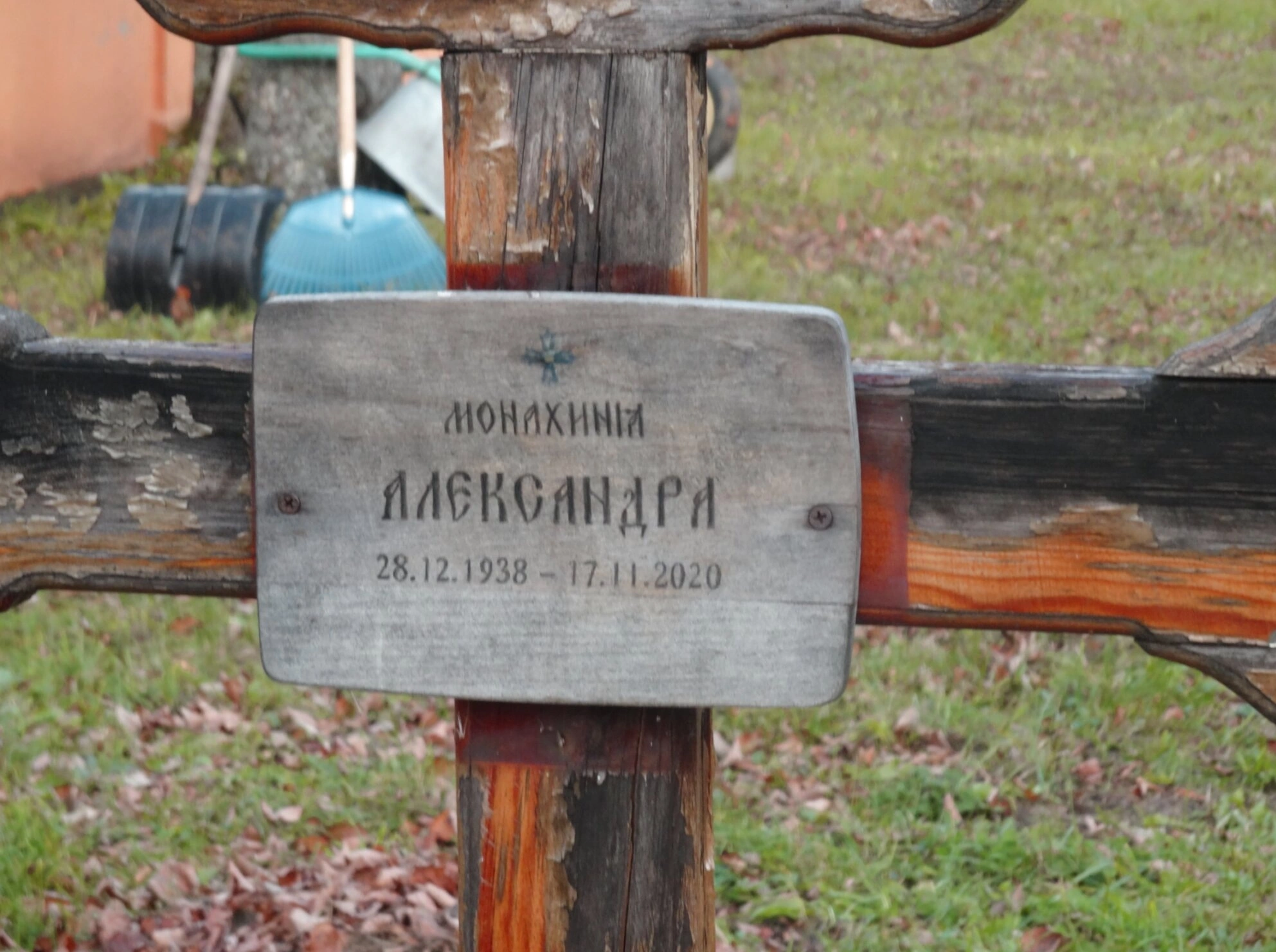 Надпись на табличке, прикрепленной к кресту, свидетельствует о глубоком почитании усопшей насельницы, посвятившей свою жизнь служению Богу и Церкви. Установка подобных крестов является древней православной традицией, символизирующей надежду на Воскресение и вечную жизнь, дарованную Господом Иисусом Христом через Его Крестные страдания. Деревянный крест, выполненный в простом и строгом стиле, отражает аскетический идеал монашеского жития, напоминая всем смотрящим о тленности земного бытия и о духовном подвиге тех, кто избрал путь иночества.
