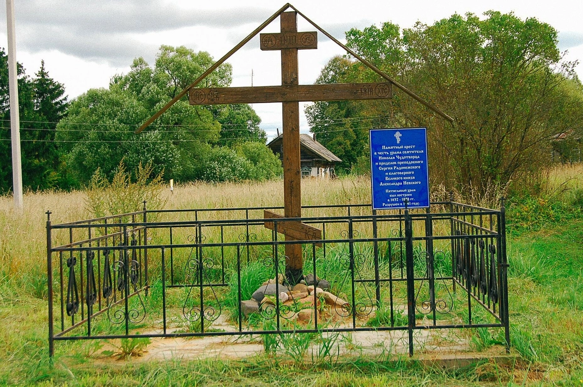 Рядом с крестом установлена информационная табличка, которая повествует путникам о скорбной истории сего места. Здесь прежде стояла каменная трёхпрестольная церковь с главным престолом, освящённым во имя Святой Троицы, и приделами, посвящёнными святому благоверному князю Александру Невскому и преподобному Сергию Радонежскому. Храм был возведён в середине XIX века на средства благотворителей и являлся духовным центром для жителей округи.