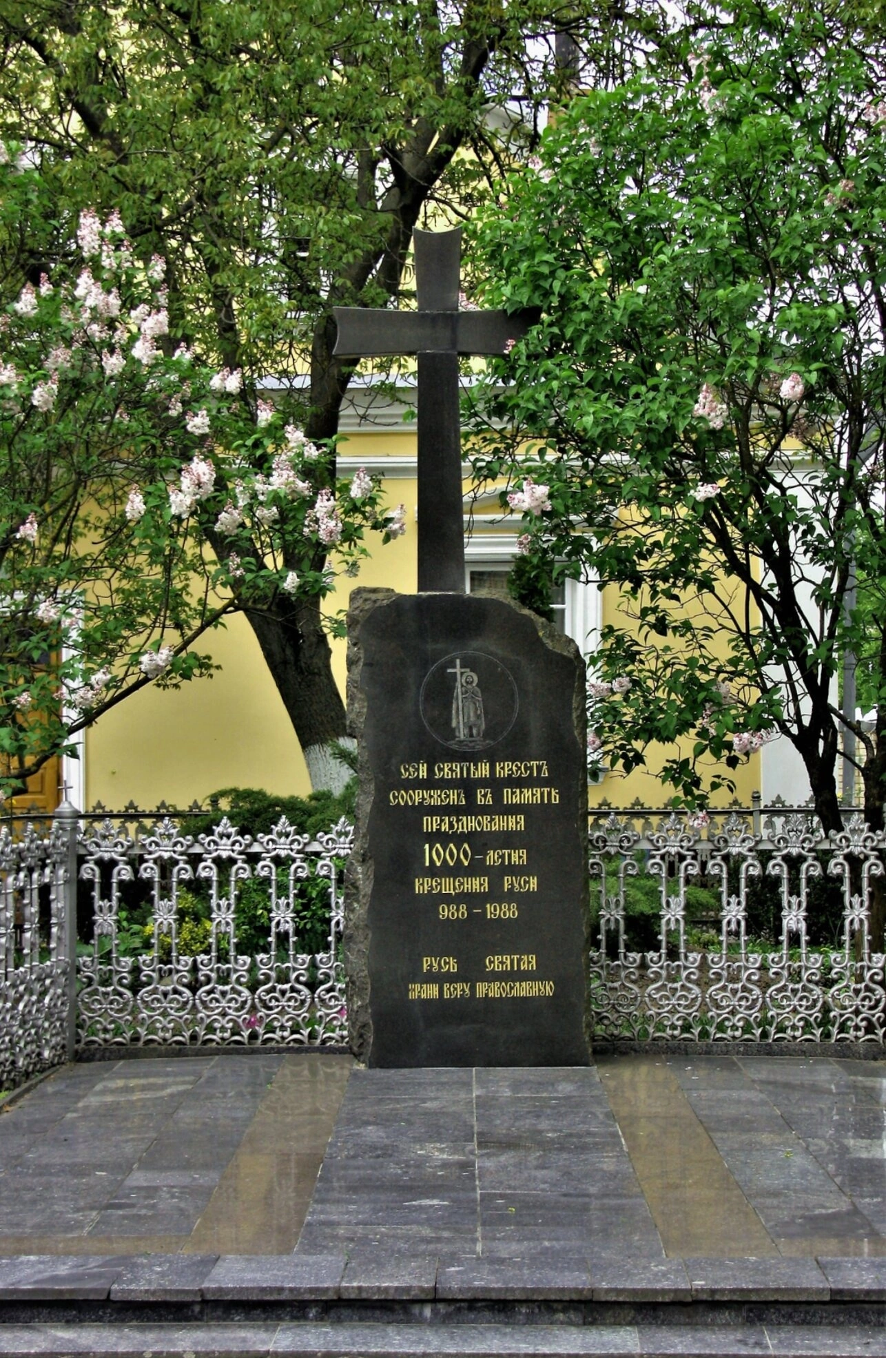 Крест выполнен из долговечного материала, вероятно, гранита или бронзы, и представляет собой не только памятник, но и объект религиозного почитания. На его лицевой поверхности высечена торжественная и глубоко символичная надпись: «СЕЙ СВЯТЫЙ КРЕСТ СООРУЖЕН В ПАМЯТЬ ПРАЗДНОВАНИЯ 1000-летия КРЕЩЕНИЯ РУСИ 988-1988». Ниже нанесён духовный завет для всех последующих поколений: «РУСЬ СВЯТАЯ ХРАНИ ВЕРУ ПРАВОСЛАВНУЮ».