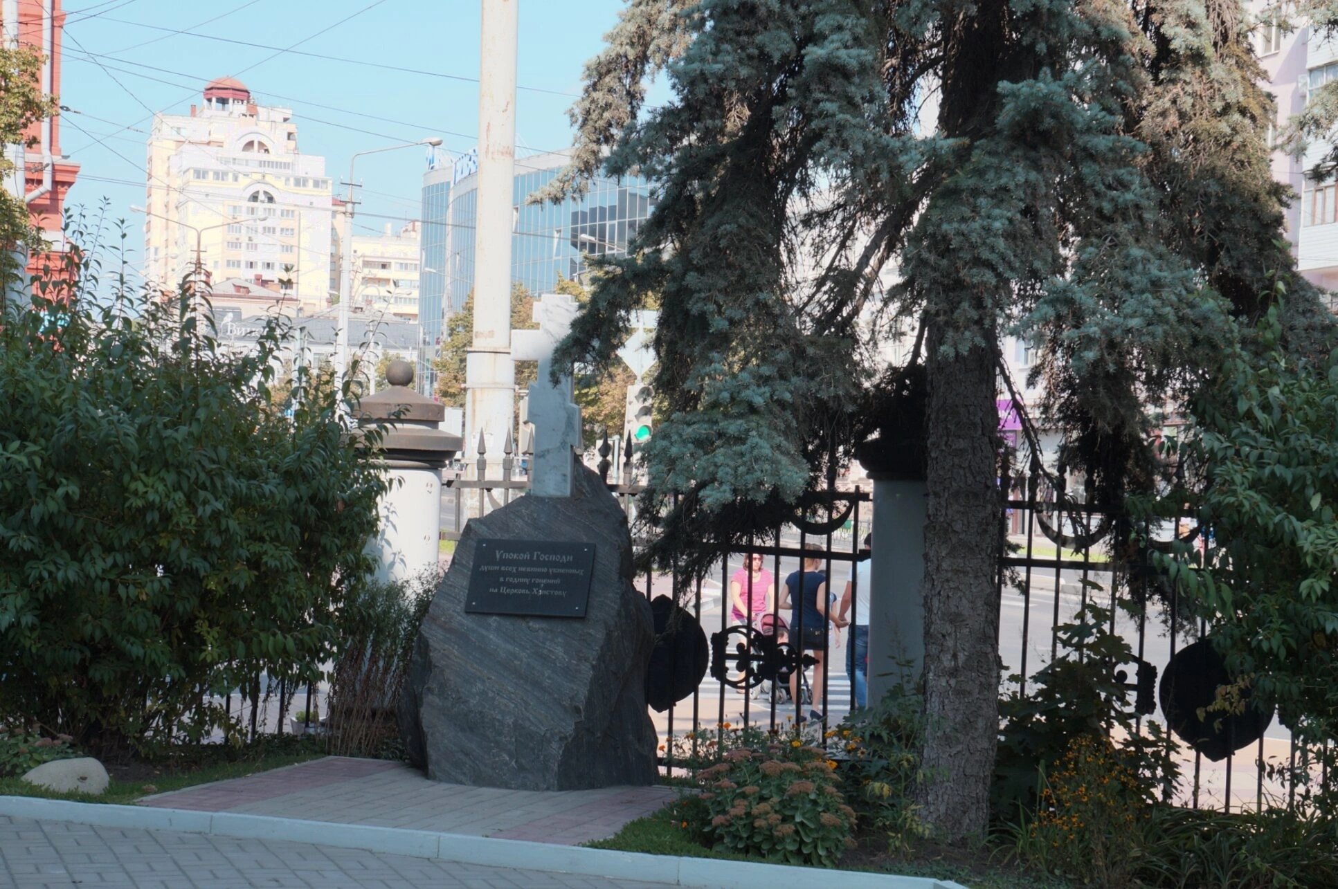 На фотографии запечатлён памятный знак, посвящённый всем невинно убиенным, расположенный в священной ограде Спасо-Преображенского кафедрального собора города Белгорода. Мемориал установлен в тихом сквере, прилегающем к собору, создавая место для молитвенного поминовения и скорби.