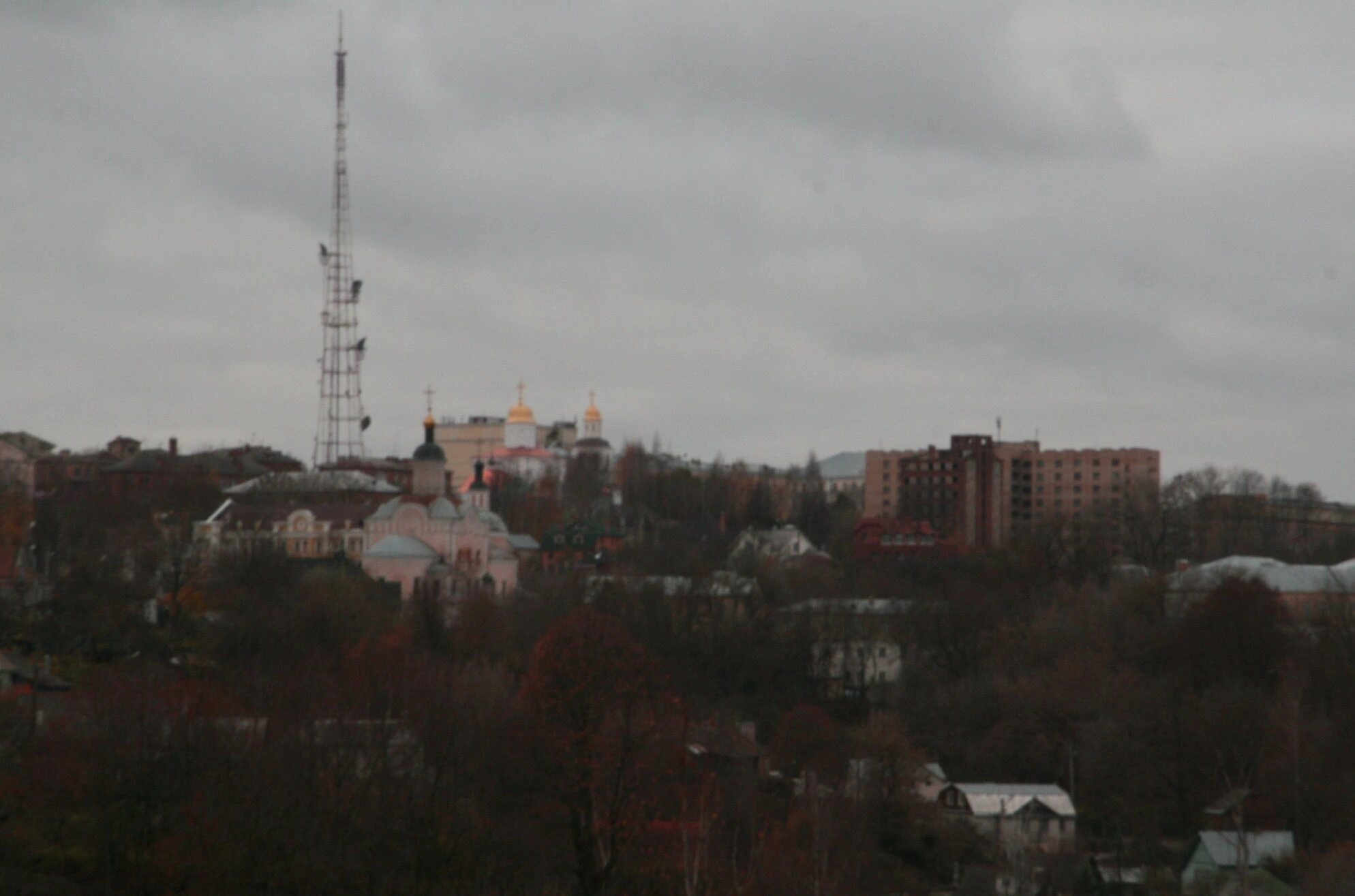 На представленной фотографии запечатлена величественная панорама древнего города Смоленска, открывающаяся с возвышенности вблизи его исторического центра. На переднем плане возвышается монументальный Успенский кафедральный собор, увенчанный сияющими золотыми куполами, которые символизируют духовное величие православной веры. Этот собор, являющийся кафедральным храмом Смоленской епархии, представляет собой выдающийся памятник церковной архитектуры XVIII века.