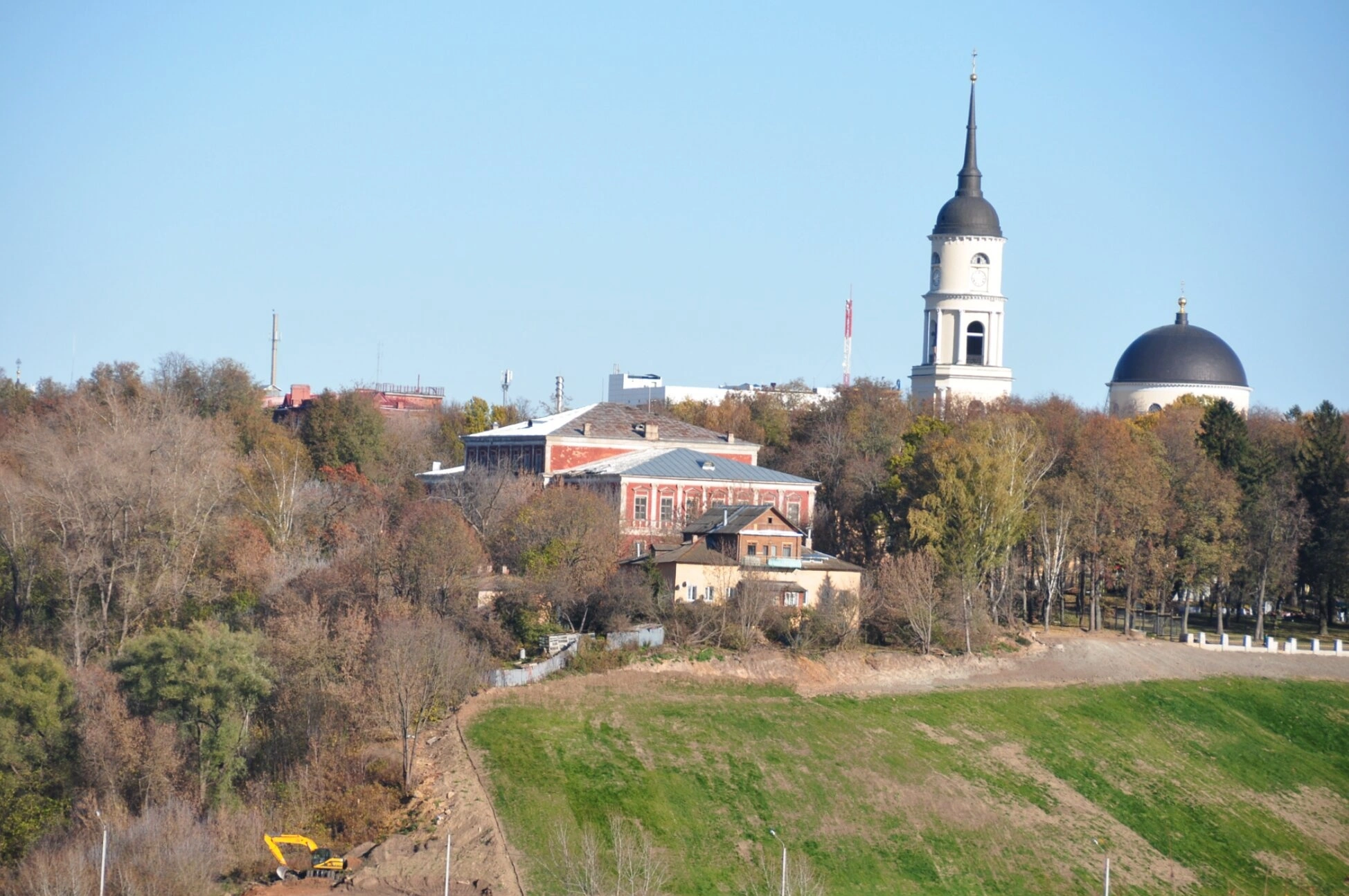 На переднем плане фотографии виден естественный склон холма, поросший травой и редкими деревьями, что подчёркивает природный рельеф данной местности. Присутствие на участке строительной техники свидетельствует о непрерывном развитии и благоустройстве территории, окружающей столь значимое для верующих место. Этот вид уникальным образом сочетает вечную духовную красоту православной святыни и динамичную мирскую жизнь города.