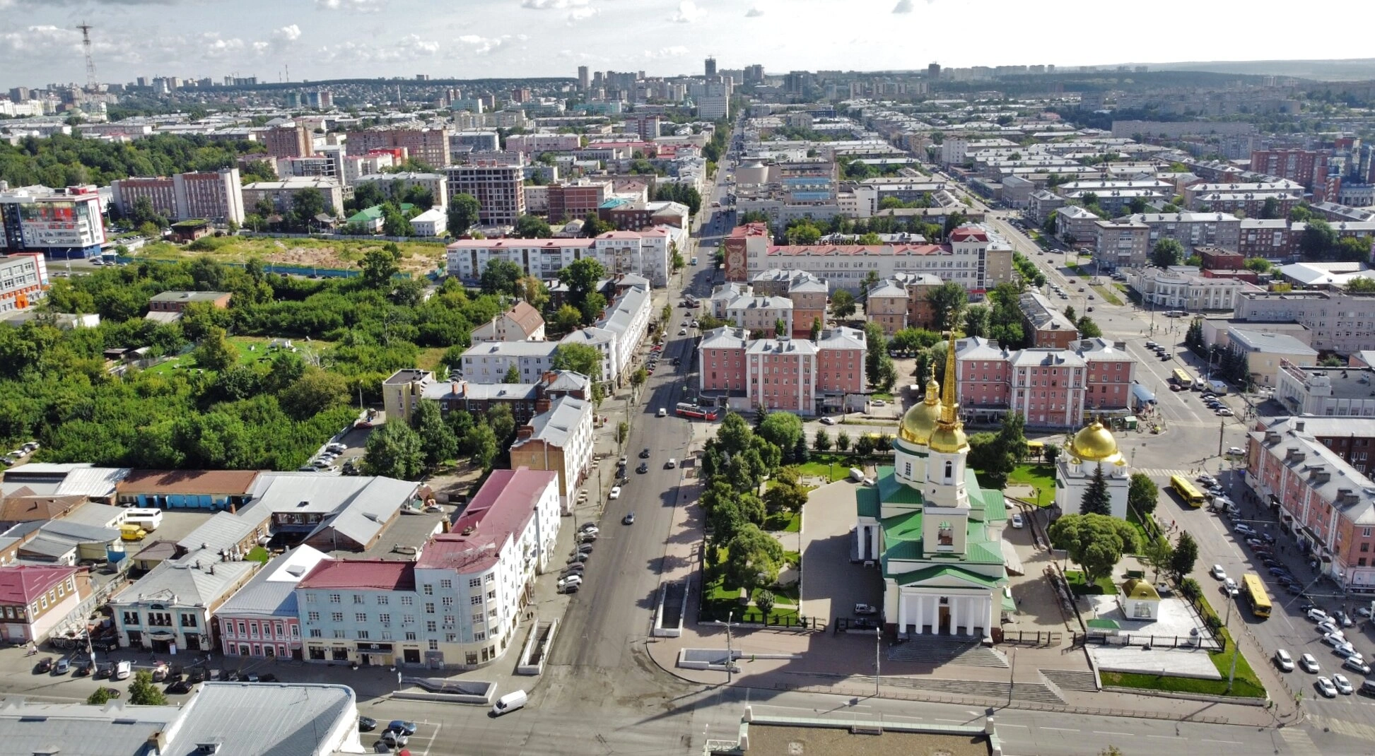 На представленной фотографии запечатлён величественный панорамный вид столицы Удмуртской Республики — города Ижевска. Центральным объектом композиции, доминирующим в правой части кадра, предстаёт Свято-Александро-Невский кафедральный собор. Его зелёные купола, увенчанные сияющими золотыми главками и крестами, а также высокая колокольня создают неповторимый силуэт в городском пейзаже.