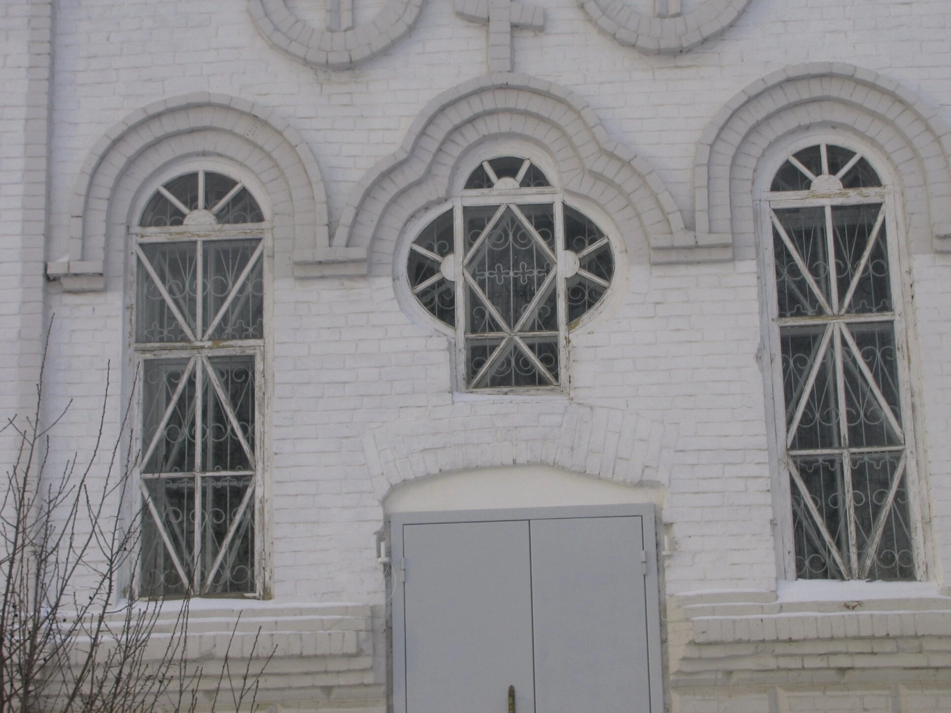 Декоративное убранство фасада дополняют кирпичные элементы, тонко проработанные мастерами-каменщиками. Над центральным оконным проемом видна часть святого креста — символ христианской веры и искупительной жертвы Спасителя.