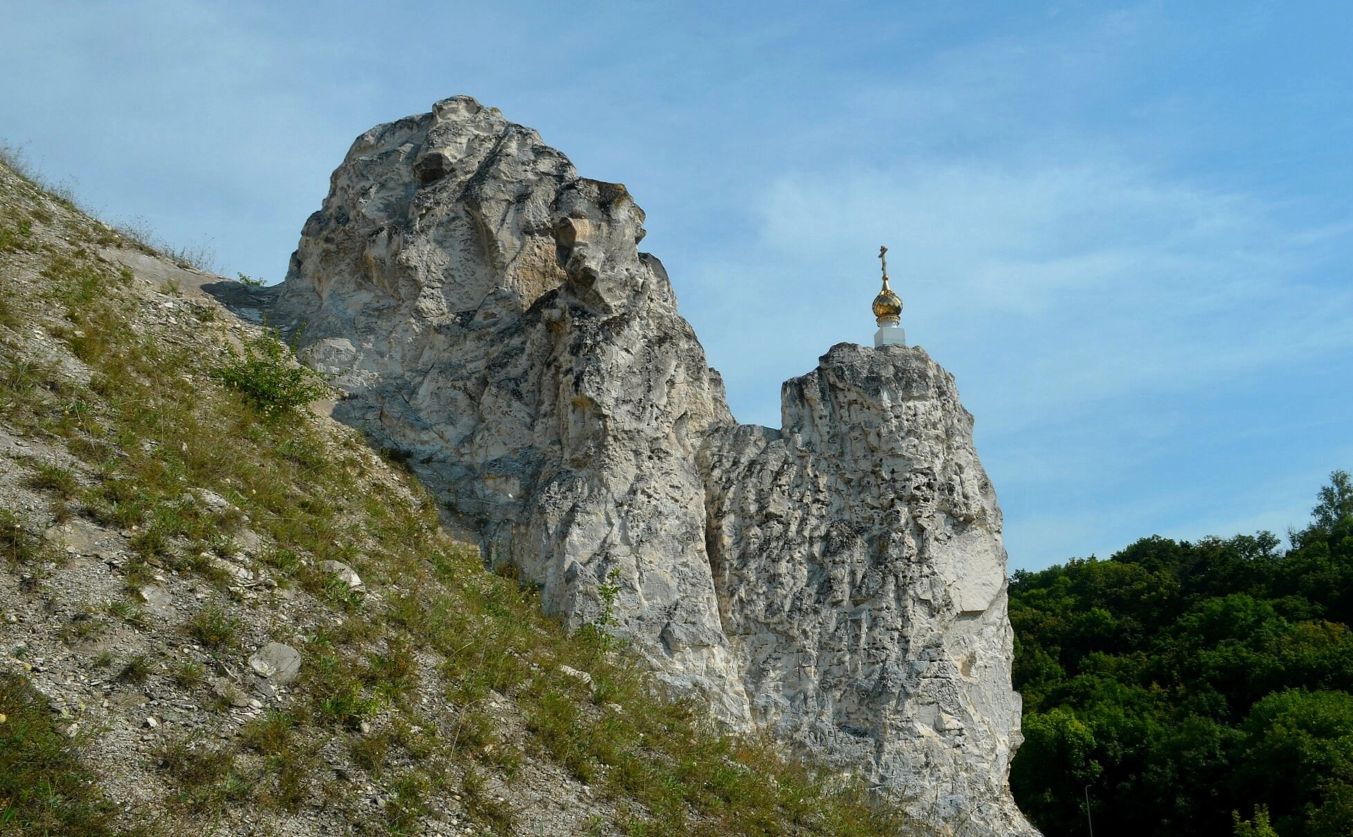 На представленной фотографии запечатлён уникальный духовный и природный памятник — меловые столбы Малых Див с пещерным храмом в честь Рождества честного славного Пророка, Предтечи и Крестителя Господня Иоанна. Святыня расположена на территории природного архитектурно-археологического музея-заповедника «Дивногорье» в Воронежской области.