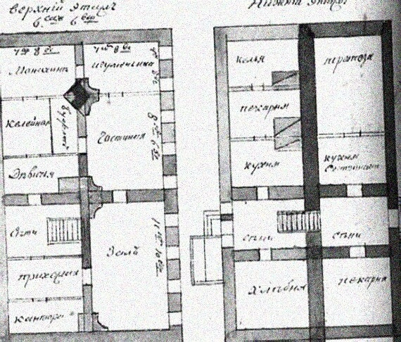 Чертеж детально показывает проект надстройки, осуществленный в 1833 году. На плане верхнего этажа обозначены различные помещения, включая келейные комнаты для монахинь, гостиную для приема посетителей, прихожую и кантору. Нижний этаж включает хозяйственные помещения: пекарню, кухню и хлебню, что свидетельствует о полноценном жизнеобеспечении обители.