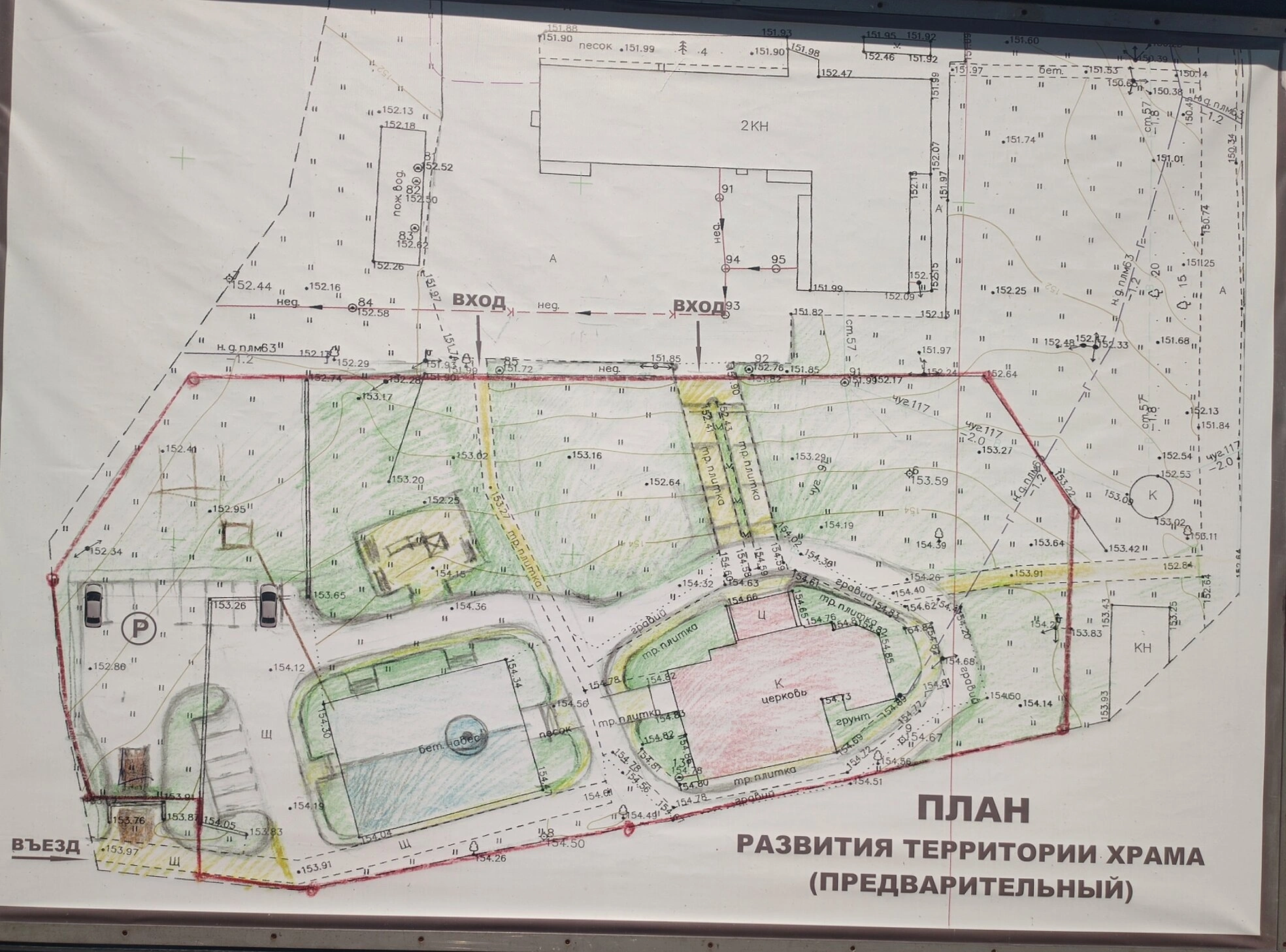 На представленной фотографии зафиксирован предварительный план развития территории храма святого Архистратига Михаила, расположенного в деревне Бегуницы Ленинградской области. Данный документ отражает концепцию благоустройства и комплексного обустройства прилегающей к храму земли в соответствии с канонами православного храмостроительства и современными градостроительными требованиями.