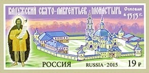 На представленной фотографии запечатлена памятная почтовая марка Российской Федерации, выпущенная в 2015 году к знаменательному юбилею — 500-летию основания Калужского Свято-Лаврентьева мужского монастыря. На марке с номиналом 19 рублей изображён архитектурный ансамбль святой обители и образ её небесного покровителя — преподобного Лаврентия Калужского, Христа ради юродивого, чудотворца.