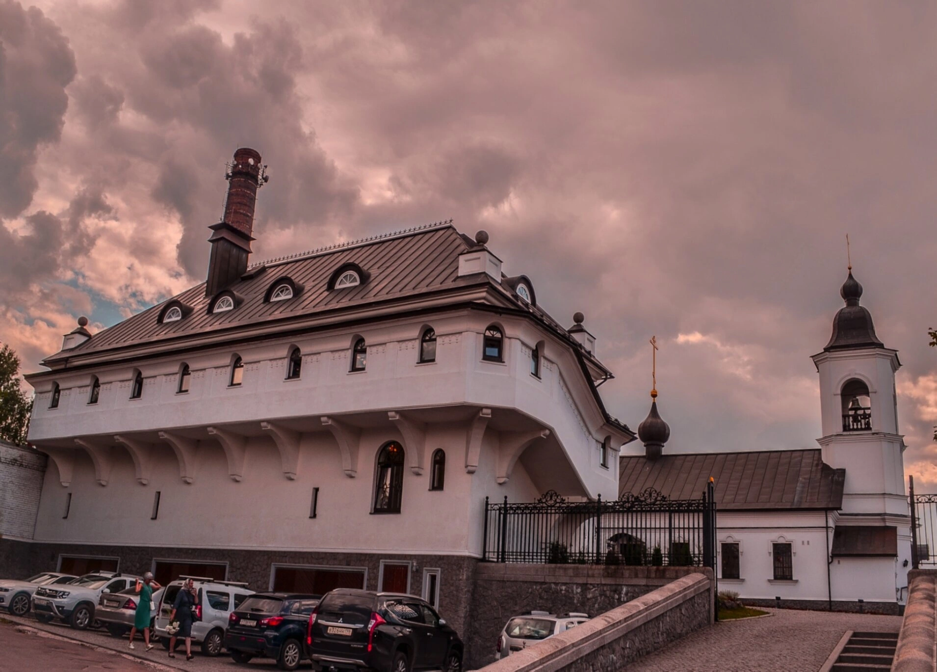 На представленной фотографии запечатлено подворье храма в честь святого пророка Божия Илии, расположенное в городе Выборге. Основное здание подворья, изображённое в центре кадра, представляет собой белоснежную постройку с тёмной кровлей, увенчанную характерной дымовой трубой. Архитектурный облик здания отличается строгостью и простотой, присущей многим хозяйственным постройкам церковных комплексов. Справа от основного корпуса возвышается колокольня, увенчанная куполом и православным крестом, что ясно указывает на принадлежность всего ансамбля к Русской Православной Церкви.