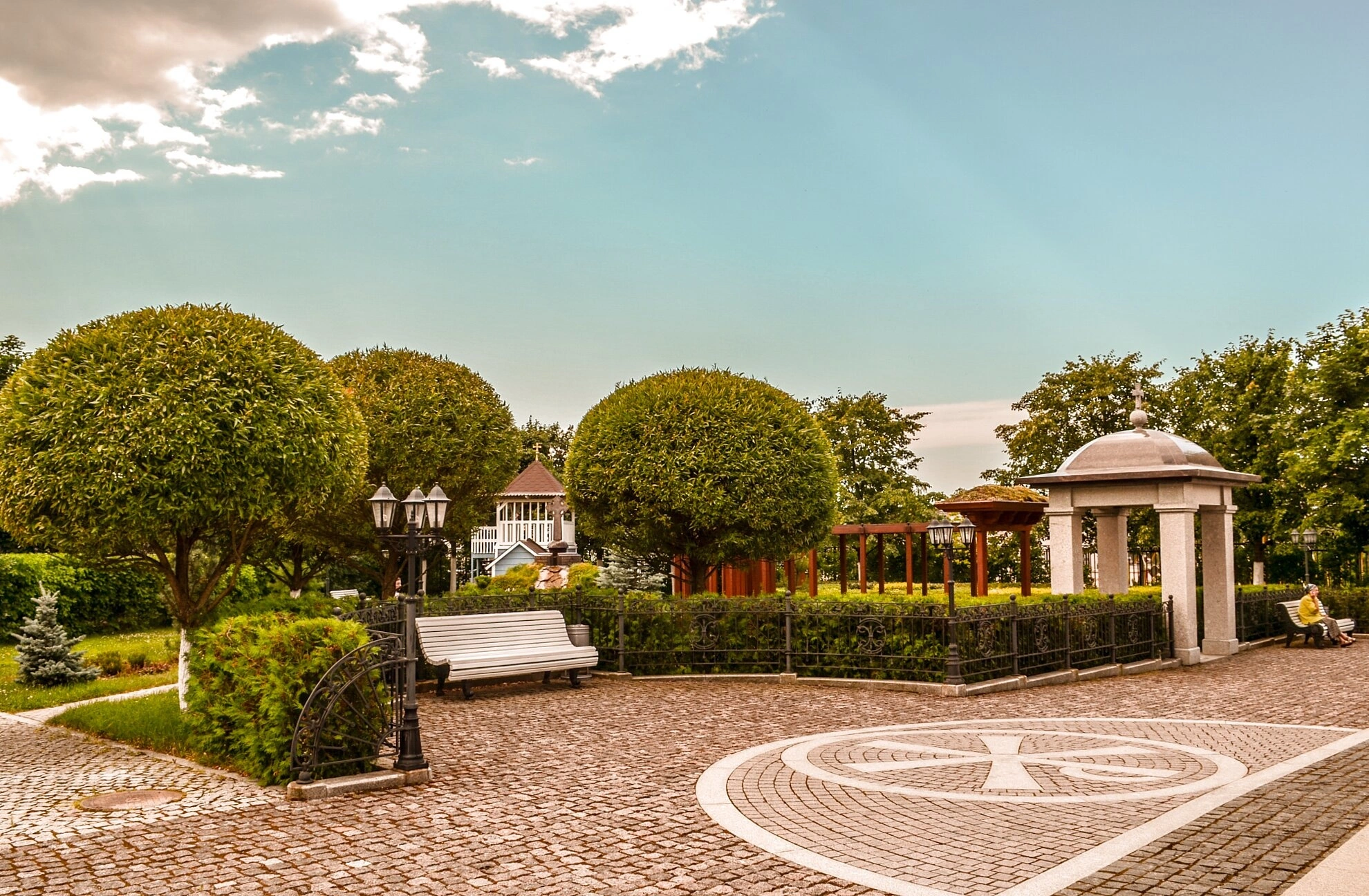 На переднем плане взору открывается мощёная дорожка, выложенная из брусчатки, часть которой украшена светлым декоративным узором, символизирующим путь к храму и духовному совершенству. В центре садовой композиции возвышаются несколько искусно подстриженных шаровидных деревьев, обрамляющих белую кованую скамью – место для благочестивого отдыха и богомыслия.