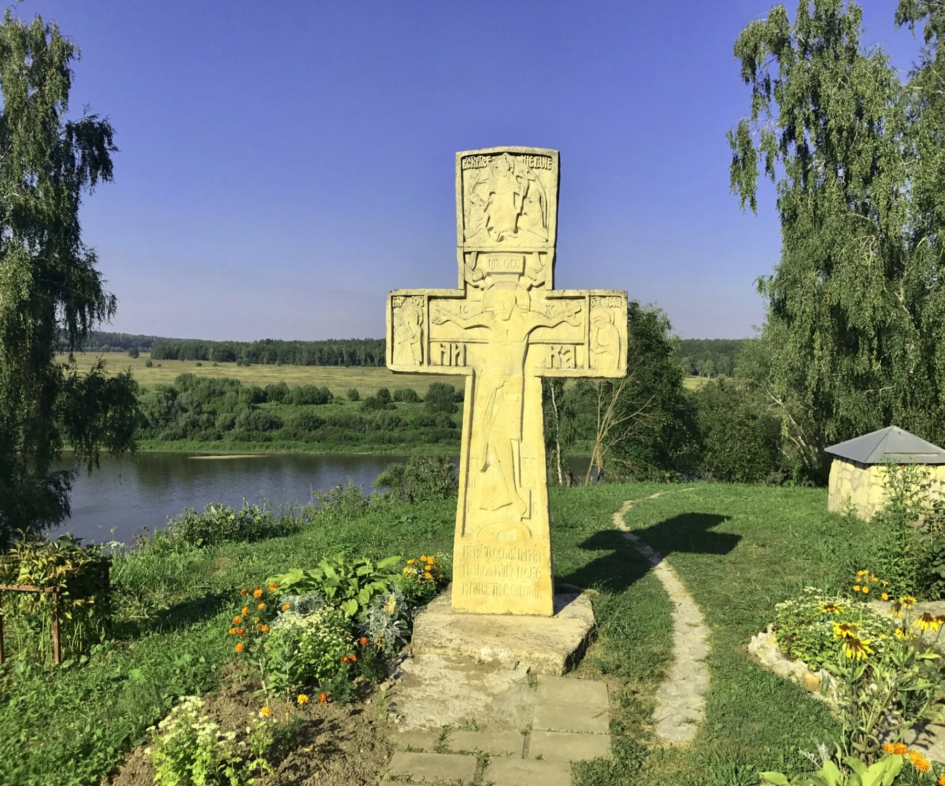 На фотографии запечатлён поклонный крест, установленный на Воскресенской горке в древнем городе Тарусе Калужской области. Этот благодатный памятник православной культуры находится в историческом месте, на территории, прилегающей к храму Воскресения Христова, по адресу: улица Ефремова, 13А.