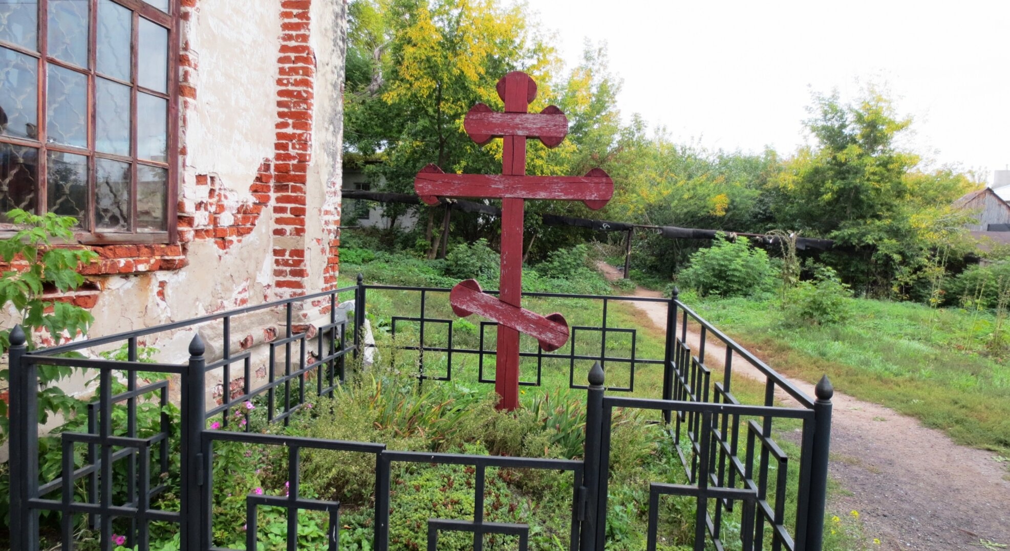 Металлический поклонный крест, окруженный ажурной кованой оградой, представляет собой традиционную для православной культуры форму восьмиконечного креста. Подобные кресты устанавливаются в знак памяти о значимых событиях, в честь освящения места или как молитвенные станции для паломников. На заднем плане четко просматривается фрагмент кирпичной стены трапезной церкви Рождества Пресвятой Богородицы, демонстрирующий характерные особенности русского храмового зодчества.